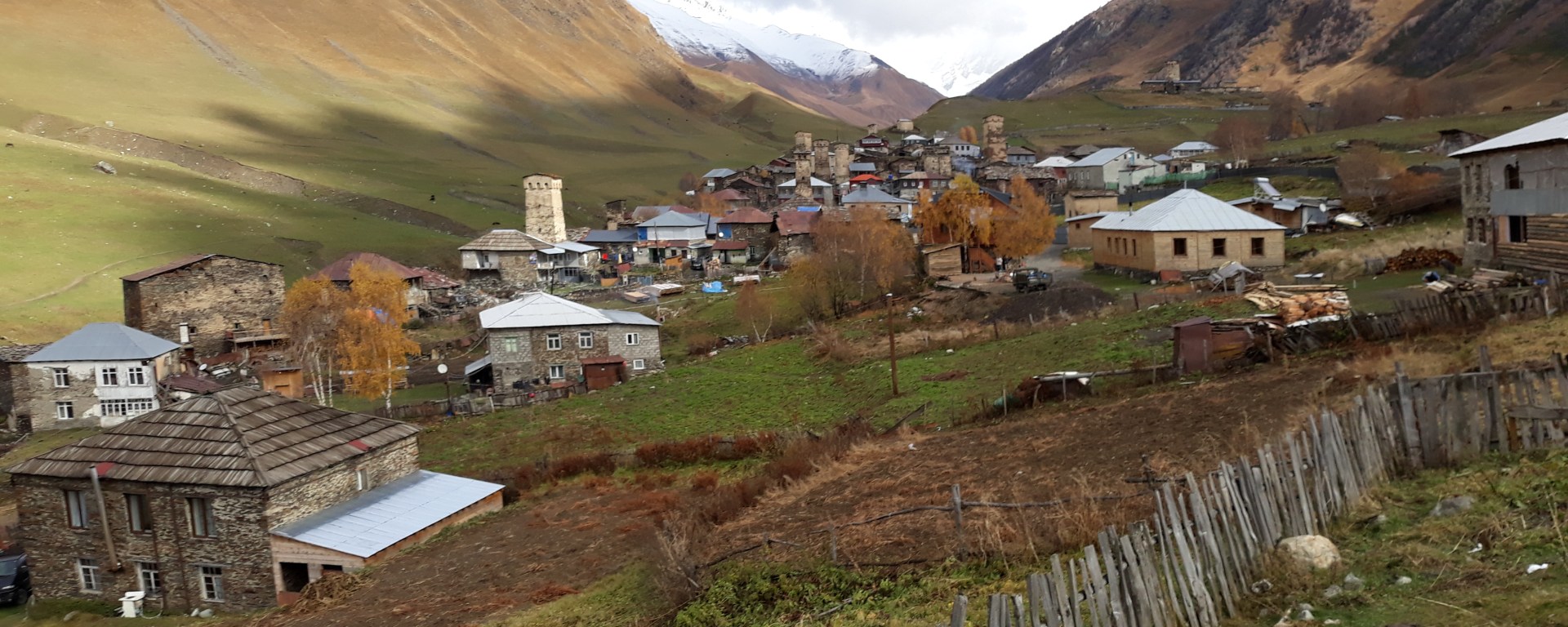 Ushguli is een pittoresk dorp op 2.100m hoogte met meer dan 20 oude Svan torens en is een Unesco erfgoed. Het zou de enige en hoogste permanent bewoonde plaats in Europa zijn. Het dorp ligt in een dal tussen 2 riviertjes in met een uitzicht op de enorme berg Shkara van 5.193m hoog. Niet alleen deze berg is op de top besneeuwd, bijna alle bergen hebben momenteel een topje verse sneeuw. De winter komt eraan! Sterker nog, volgens de weersverwachting komt er niet alleen meer regen maar ook verse sneeuw aan. Wij checken zo snel mogelijk in een guesthouse in en gaan voor een wandeling naar een bergtop op 2.900m hoogte voor een 360’ uitzicht. Nou ja, dat dachten we. Met de zon de berg op, met de buien in de verte in aantocht, redden we de top net. En dan begint het te sneeuwen, is het uitzicht vooral op de wolken en wordt het flink kouder. Als we een paar honderd meter zijn afgedaald, is het weer helder en droog. We gaan niet meer terug, het is prachtig geweest en als we verder dalen gaat het regenen en mogen we opwarmen in de keuken van ons guesthouse. De houtoven is –overal waar we komen- de warmtebron bij uitstek. En dus verzameld jan en alleman zich altijd in de keuken. Onze slaapkamer en zitruimte is een graad of 10-15’C, dus daar zijn we zo min mogelijk.