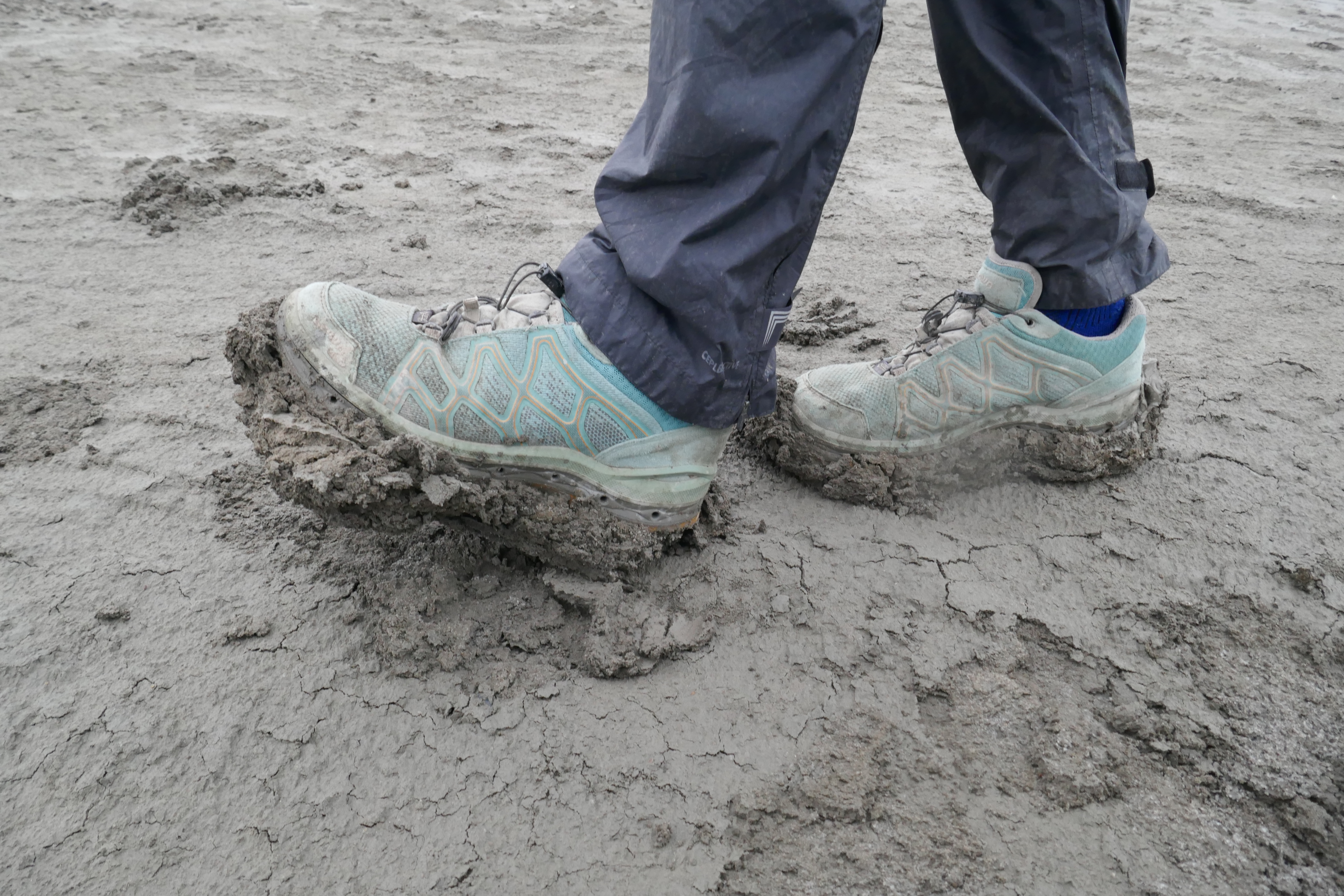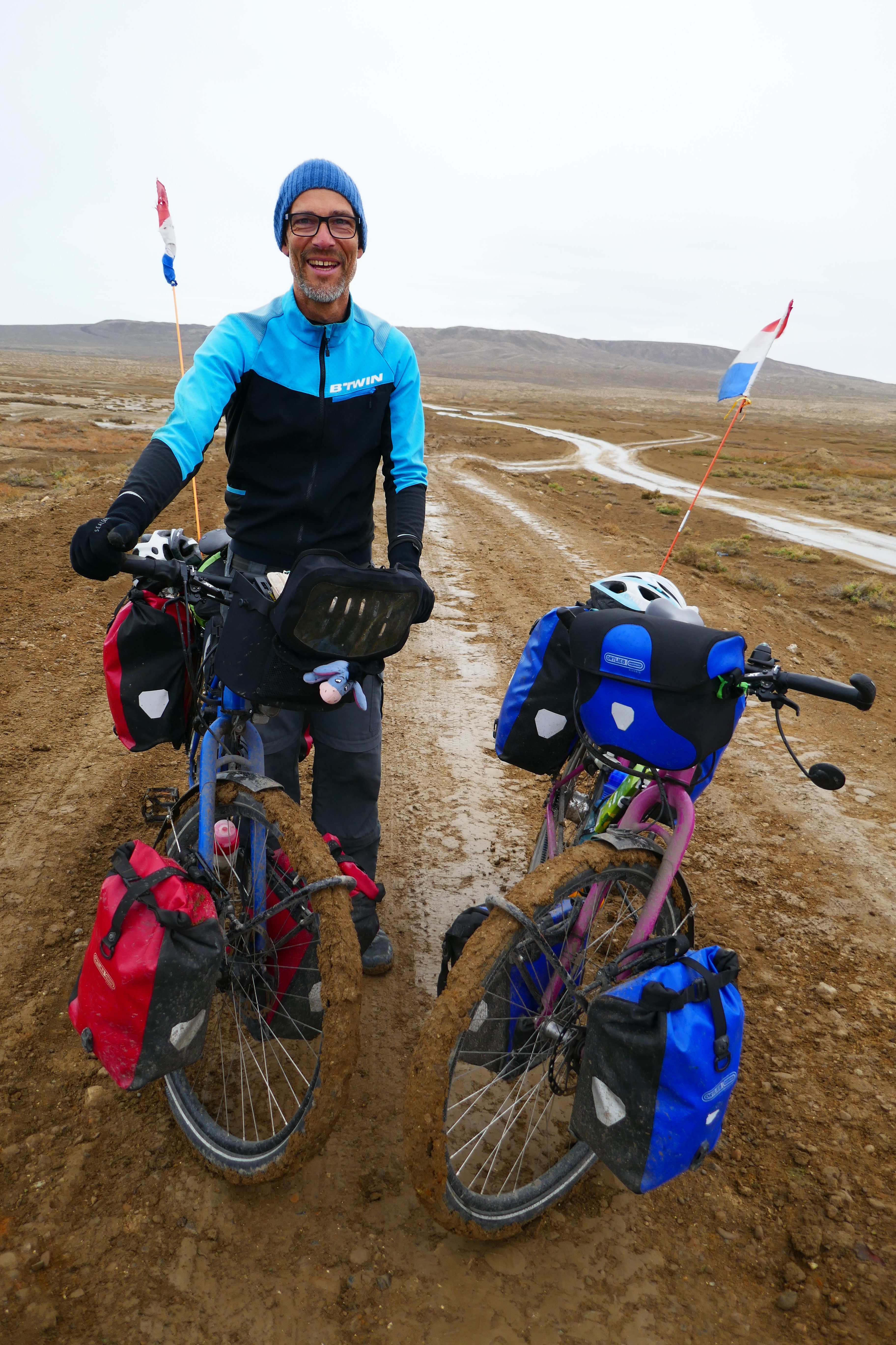 Van Alat fietsen we in één dag naar Bakoe. Maar niet rechtstreeks, want we willen een aantal bezienswaardigheden aandoen. Ten eerste moddervulkanen. Je hoort het goed, moddervulkanen! Dat klinkt zo al boeiend! In Azerbeidzjan is de helft van alle moddervulkanen ter wereld te vinden. Daarnaast is er een belangrijke archeologische vindplaats waar rotstekeningen en inscripties in rotswanden te vinden zijn van 13.000 voor Christus tot de Romeinse tijd. Via een onverharde, maar goed begaanbare weg, komen we bij een verzameling moddervulkanen uit. Wat een bijzonder gezicht is dit. Overal mini kegeltjes, de grootste een meter of drie hoog, de kleinste een paar centimeter. Allen met sputterend en bubbelend modder die zijn weg naar buiten vindt. Die modder is een ongelooflijk plakkerig goedje en het lopen door dit modderpaleis gaat dan ook steeds zwaarder. Als we uitgespeeld en uit gefotografeerd zijn, wegen onze schoenen 3 kilo zwaarder en zijn we 5 centimeter langer geworden. Voordat we op de fiets stappen, schrapen we zo goed en zo kwaad als het kan de ergste modder van onze schoenen. We hebben een kilometer of 20 over een onverharde weg te gaan, die meestal goed te fietsen blijkt. Meestal, want op één punt moeten we door een bak hele dikke modder fietsen. De modder is net zo plakkerig als het goedje waar we doorheen hadden gelopen, dus de banden worden dikker en dikker en de wielen draaien steeds moeilijker rond. Als Auke dan ook nog vast komt te zitten en in de modder omvalt, zit er niks anders op dan de fietsen voorzichtig op het ‘droge’ te duwen en te bevrijden van de centimeters dikke laag drek. De fietsen (en wij) hebben er deze reis nog niet zo vies uitgezien. Zelfs niet na de Svaneti vallei in Georgië. Oordeel anders zelf maar.