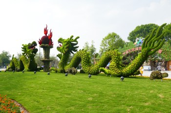 De donderdag gaan we na een heerlijk ontbijt, met dat vers gebakken bruinbrood, op Hollandse fietsen de stad in. Wim en Jenny hebben ieder een kleurrijke Santos (NLs merk wereldfiets) die naast onze Avaghon wereldfietsen Iejoor en Knorretje niet misstaan. We bezoeken de oude stad (zoals overal in China herbouwd), een park, drinken een biertje op een terras en zijn verwonderd over de grote, moderne stad met heel veel groen; de gemaakte natuur. De flyovers bestaande uit 3 lagen zijn bekleed met klimop. Op rotondes en in parken staan prachtige geknipte ‘beeldhouwwerken’ van planten. Overal is het groen tussen de nieuwbouw.