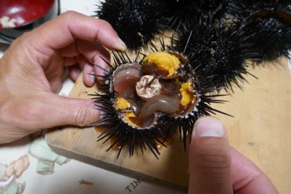 Om te beginnen krijgen we Gengkis Khan voorgeschoteld; kleine stukjes gegrild schapenvlees. De vorm van de stukjes vlees hebben de vorm van het hoofddeksel van de beruchte Mongoolse heerser, Gengkis Khan. Vandaar de naam. Daarna wordt levende ‘uni’; zee-egel voorgeschoteld. Terwijl de stekels heen en weer bewegen, wordt er met een soort lepel/notenkraker op de zee-egel aangevallen, waarna de schaal opensplijt. Geen simpele handeling. Gelukkig geldt ook hier: oefening baart kunst. Oók de aanblik van een ópengebroken zee-egel doet je bepaald niet watertanden! Er zit verrassend weinig eetbaars in. De zee-egel bevat wat ingewanden, die niet gegeten worden en wat smurrie uit de zee. Het enige dat gegeten wordt, zijn de vijf gonaden, oftewel geslachtsorganen (!) (geel tot oranje van kleur), welke verrassend zoet smaken. Totaal niet wat je van een zeedier zou verwachten. Het is een pure en dure delicatesse in Japan die overal te koop ligt. Eindelijk kunnen we erover meepraten 😉 Het is best lekker! Echter niet de immens hoge prijzen waard….