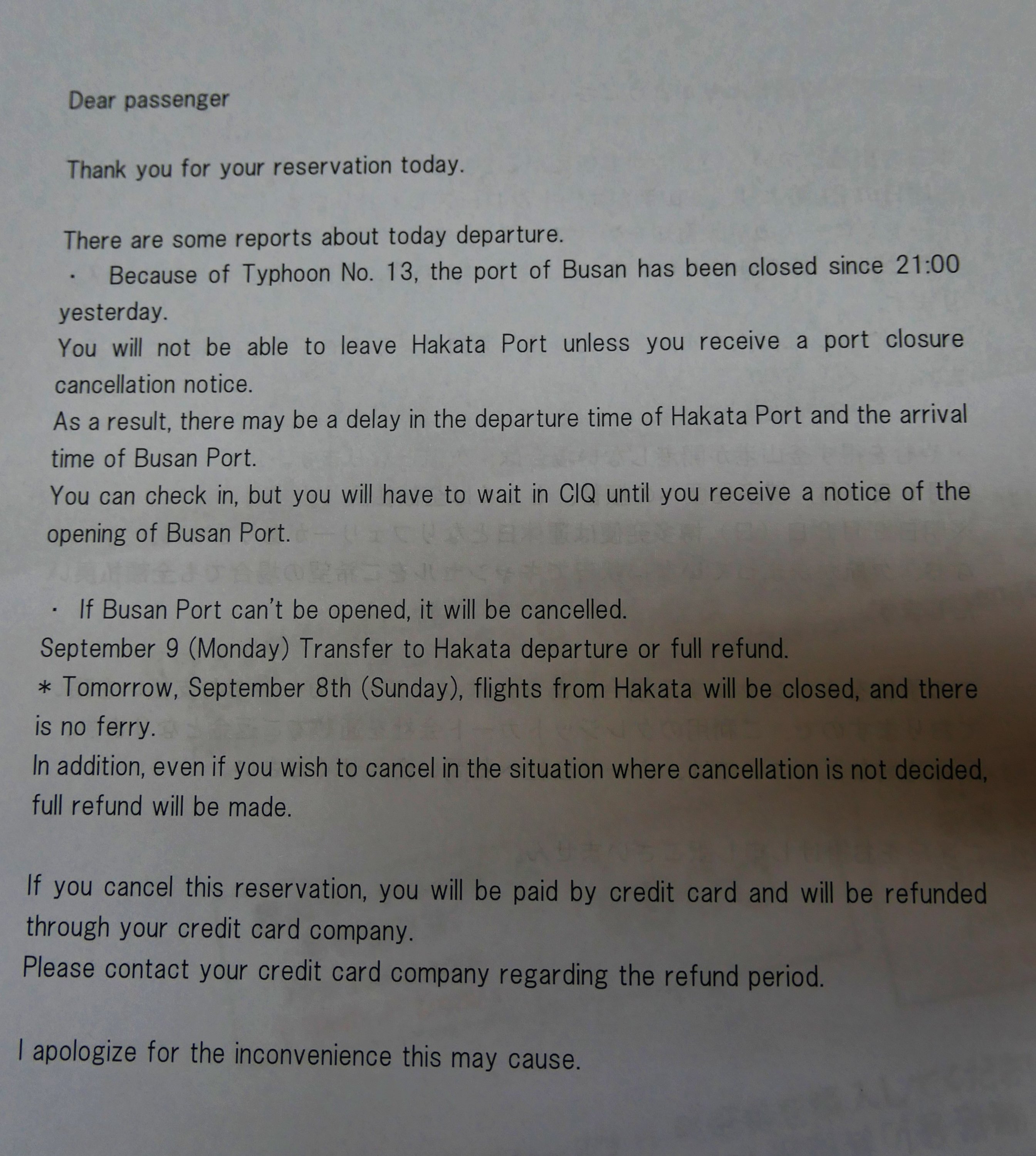 De ferry was tot ons grote geluk maar 30 minuten te laat. De ferry die normaliter netjes op tijd vaart, had te dealen met tyfoon nummer 13. Nummer 12 was zojuist voorbij gevlogen en nummer 13 ging tussen Japan en Zuid Korea door en raakte vooral het eiland Jeju. In Japan merkten we vlak voor vertrek een enorm sterke wind, zoals we in de afgelopen maanden niet hadden ervaren. De boot kon echter wel vertrekken. De haven van Busan was al 12 uur gesloten en dus was het hopen dat deze weer op tijd open ging. Onze trage boot van Camillia doet er 7u over en kan de wind en golven überhaupt wel aan, terwijl de snelle boot de Beetle is gecanceld vanwege de tyfoon. Eigenlijk hadden we een nachtboot (12 uur durend) willen nemen vanaf Shimonoseki, maar daar wilden ze geen fietsen aan boord. Nou ja, niet zonder ze uit elkaar te halen en in een tas te stoppen. Iets waar we een hekel aan hebben. Bovendien kunnen we zonder de fietsen de bagage niet dragen. Achteraf is het wikken en wegen welke boot/organisatie we zouden kiezen toevallig de moeite waard geweest en de Camillia ferry de juiste boot. Met de nachtboot zouden we midden in de tyfoon zitten, als hij al niet geannuleerd zou zijn…