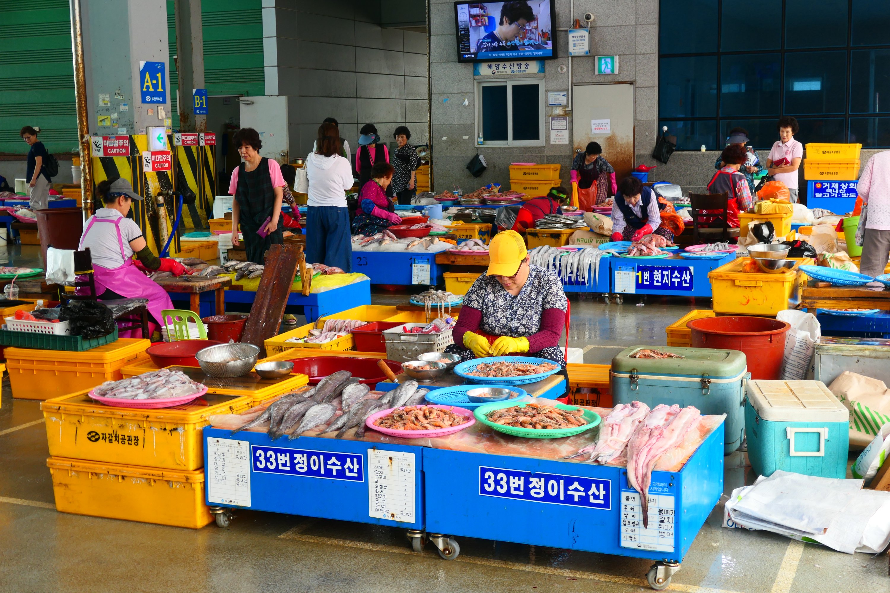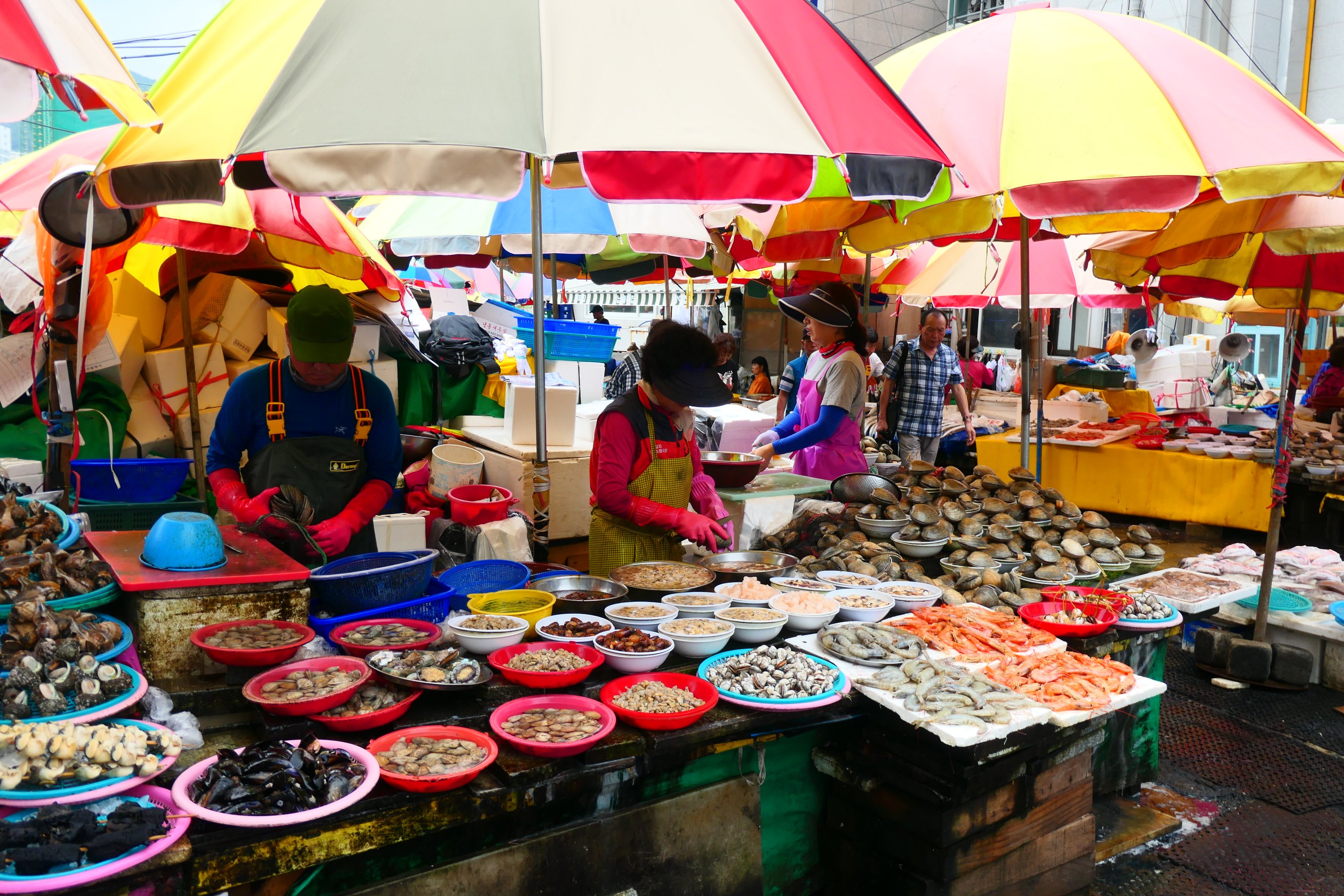 Wat een kleur, wat een geur, wat een levendigheid, je raakt bijna overprikkeld door alles om je heen. We zijn op de alom bekende Jagalchi markt. Een markt vol vis, schaal- en schelpdieren. We hebben tijdens deze reis geregeld vismarkten bezocht, onlangs nog in diverse steden in Japan. Hoge verwachtingen hebben we niet, we hebben alles inmiddels toch wel een keer gezien? Nee dus. Dit is Zuid-Korea, dit is Busan, dit is baas boven baas. We worden in de eerste instantie overvallen door het kleurenpalet à la Mondriaan op zijn best. De dames en heren dragen kleurrijke shirts met daaroverheen roze, gele, groene en blauwe schorten. Hun handen zijn in kleurrijke, rubberen handschoenen en hun voeten in, jawel, kleurrijke rubberen laarzen gestoken… En je outfit hoeft niet één en dezelfde kleur te hebben, nee je mixt en matcht naar hartenlust. Alsof dat niet genoeg is, zijn alle bakken en teiltjes ook in felle, frisse kleuren uitgestald. Kan je niet tegen zoveel indrukken, dan kom je niet verder dan de drempel. Onze camera maakt overuren. We kijken onze ogen uit. Niet alleen de kleuren, ook de vissen, de garnalen, kreeften, schelpen en ondefinieerbare creaties trekken onze aandacht.