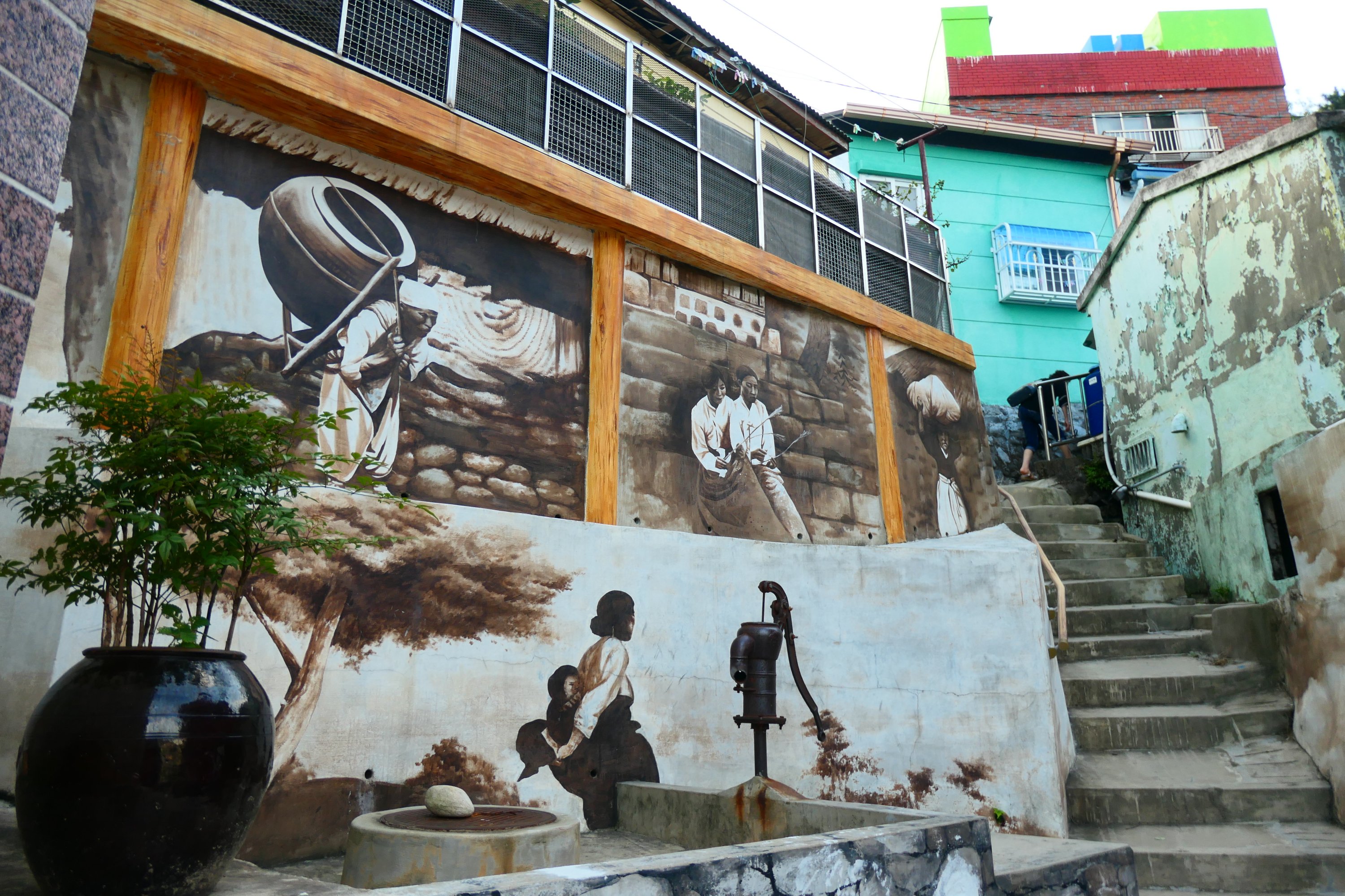 We bereiken Gamcheon Culture Village. Het laatste stuk lopen we, de wijk ligt hoog op een berg en het hellingspercentage is op sommige stukken 15-20%. Lopen is al enorm pittig. Gamcheon is een oude ‘sloppenwijk’, omgetoverd in een toeristische attractie. Sinds 2009 heeft het een artistieke make over gehad. De wijk met zijn megasteile straatjes, smalle trappen en zijn piepkleine huisjes, loopt over van kleur en creativiteit. Overal zijn muurschilderingen, mozaïeken, beelden en andere kunstzinnige uitspattingen. Daarnaast vind je ateliers, cafés, restaurantjes en winkeltjes zodat de lokale economie gesteund wordt. Ondanks dat het opgezet is voor toeristen, is het ontzettend leuk om er rond te lopen. Het is nog altijd in eerste instantie een woonwijk voor de lagere sociale klasse. Ze lijken wel goed te boeren, gezien de grote duurdere auto’s die voor de kleine woningen staan.