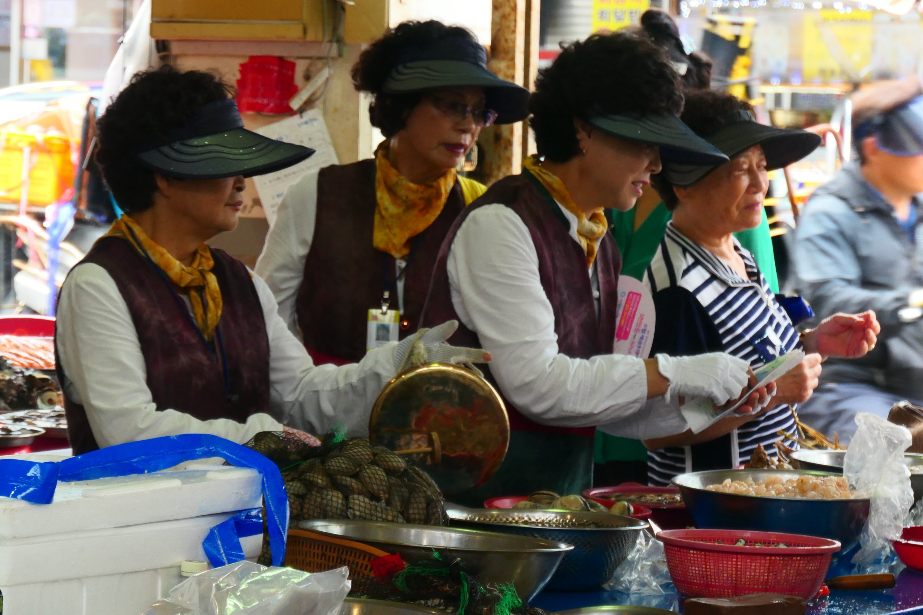 Koreaanse vrouwen zijn erg op het uiterlijk gericht. Ze besteden heel veel zorg aan kleding, persoonlijke verzorging en make-up. Wat ons direct opvalt aan deze vrouwen (op de vismarkt en) van een bepaalde eh middelbare leeftijd, zeg mijn (Aukes) leeftijd, is dat ze er allemaal hetzelfde uit zien. En als we zeggen allemaal, dan bedoelen we allemaal. We geven de schets: zwarte broek en kleurrijke bovenkleding, grote zonneklep op het hoofd, lippenstift en een kek permanentje met bobline.