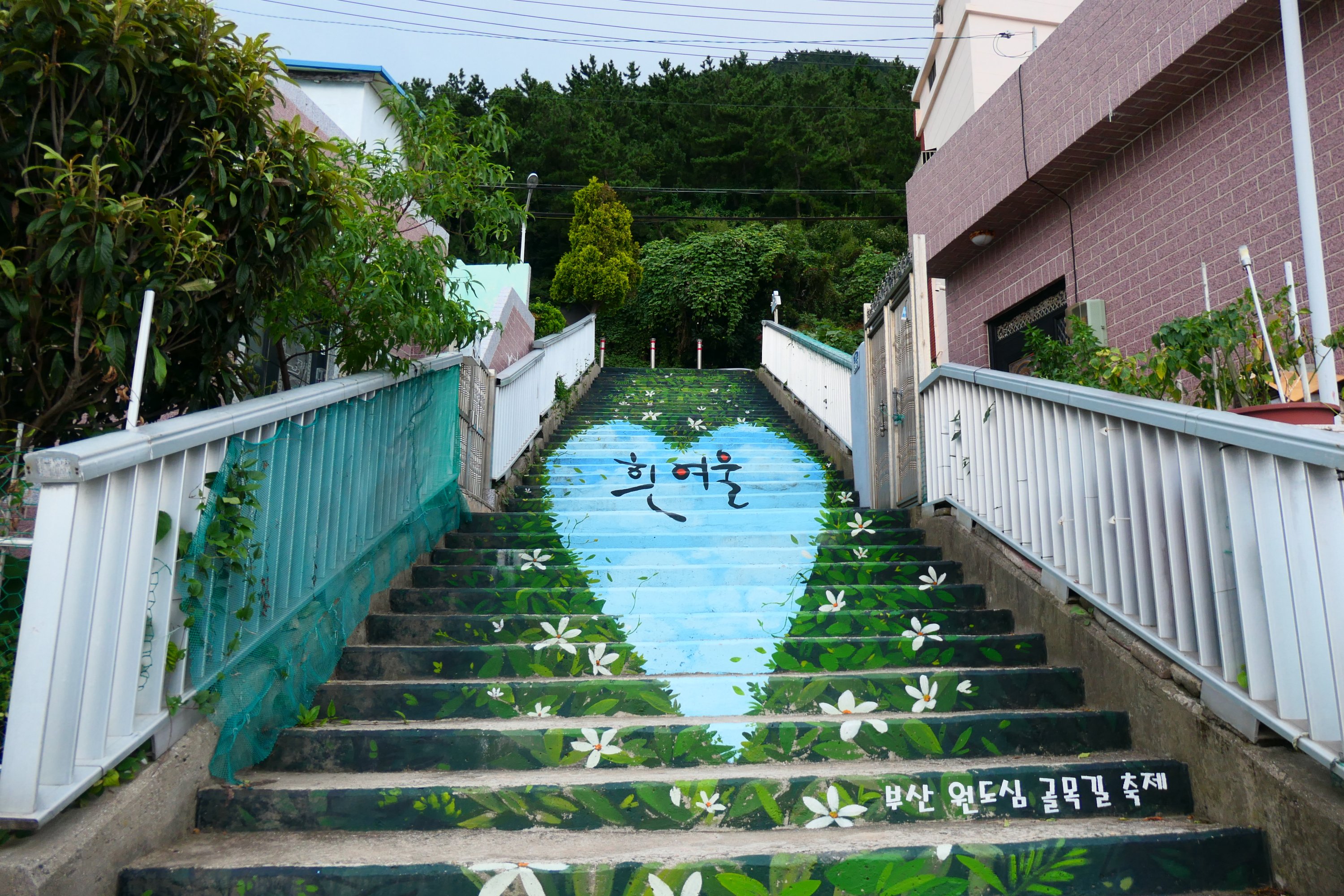 We bezoeken het wat zuidelijker gelegen Yeongdo-su (schier)eiland. We laven ons andermaal in de creativiteit van de Koreanen. Bij het Songdo strand en Huinnyeoul Culture Village. Wederom een bom aan creativiteit om de meest simpele dingen, met weinig, leuk te maken: mozaïek, muurschilderingen, beschilderde trappen, kleurrijk verlichte tunnels en bruggen. Het is echt een feest om hier te zijn. Hilgien loopt over van de inspiratie en kan bijna niet wachten thuis te zijn en met ons huis aan de slag te gaan. Ideeën genoeg om bij terugkomst de eerstkomende maanden ook nog niet te (kunnen) werken 😉