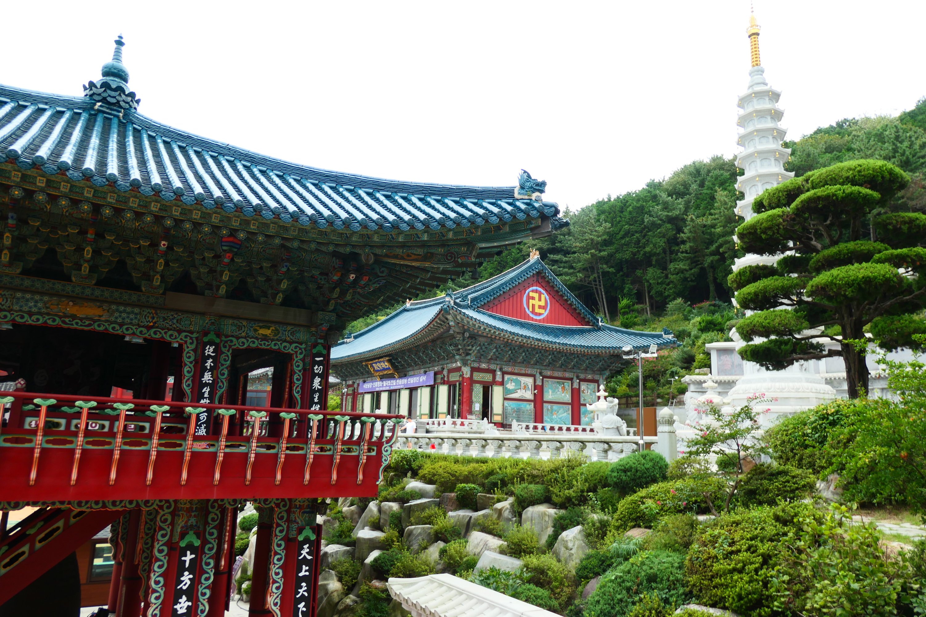 We fietsen bepakt via bezienswaardigheden naar de andere kant van Busan. Volgeladen een omweg maken is niet zo’n goed idee als je bedenkt dat ‘san’ (van Busan) berg betekent… Ossie gaf een route van 16 km aan, wij begrijpen hijgend, puffend en zwetend waarom onze route van de helft aantal kilometers niet een betere keuze was… Grrrr… Bij aankomst blijken de inspanningen gelukkig de moeite waard. We zijn bij de Samgwangsa tempel, een vrij nieuwe tempel uit 1986 met een indrukwekkend aantal tempels op de 120.000 m2 grond wat het beslaat… Het tempelcomplex, wat dus een betere woordkeuze is, is vooral bekend om het lantaarn-festival wanneer 50.000 lantaarns worden verlicht. Een plaatje wat ons deze kant op heeft getrokken. Het is nu echter geen geboortedag van Boeddha en dus geen extra verlichting. De immense gebouwen, het minutieuze verfwerk, alle details… het is adembenemend… De term monnikenwerk vergeet je nooit meer.