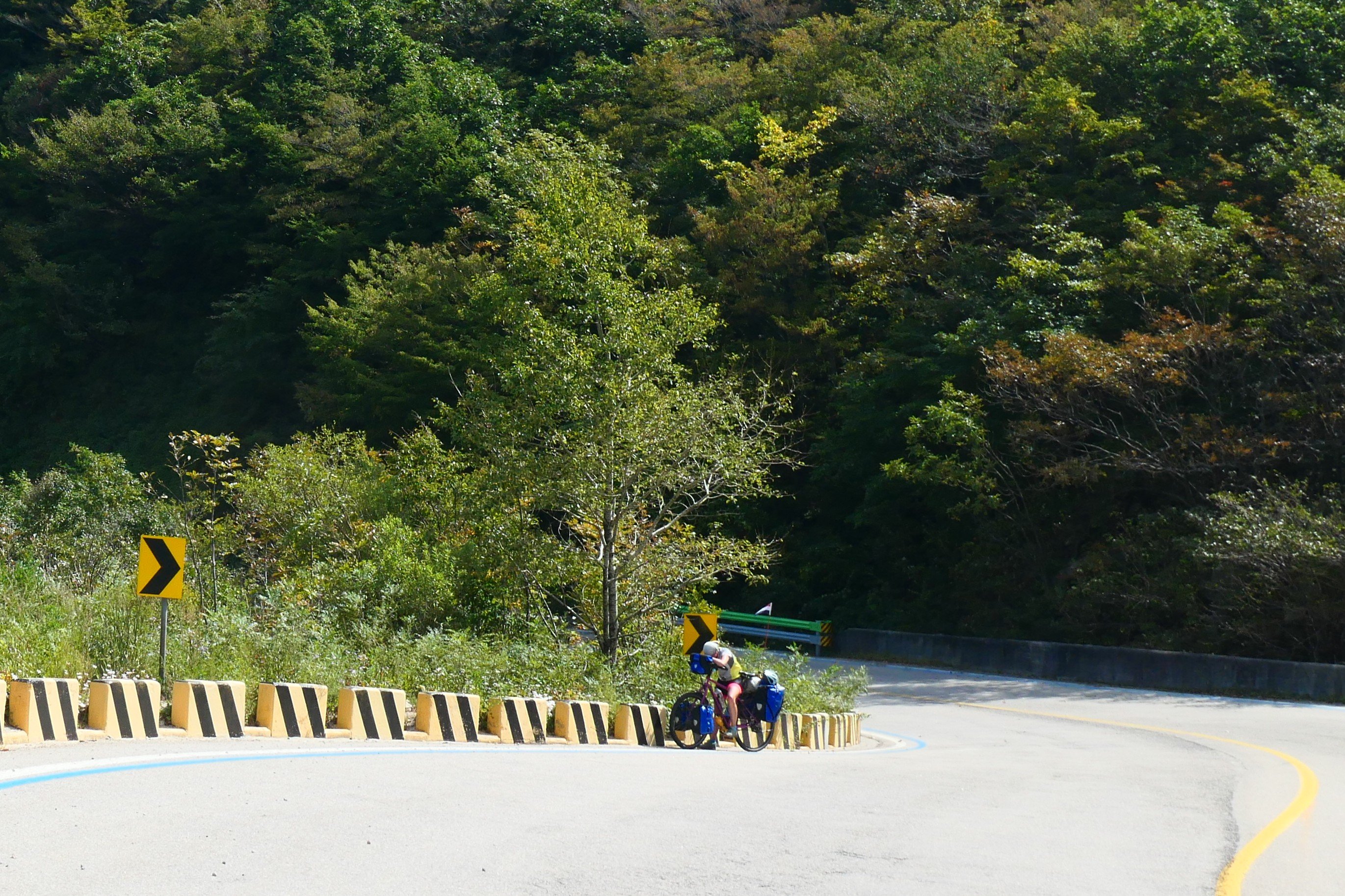 850 hoogtemeters over de eerste 30 km in het vooruitzicht is geen hele lekkere ontwaakgedachte. Maar we moeten eraan geloven. Om van Sokcho naar Seoul te gaan moeten we de bergen over. De enige uitweg (naast de bus) is een tunnel van 6km. Een tolweg-tunnel waar fietsers niet gewenst zijn en een tunnel die doorgaans geen ruimte biedt aan de fietser. Dus klimmen we eroverheen. We klimmen en klimmen en zien jaloers de rechte weg onder ons lopen. Better safe than sorry. Japan maakt prachtige wegen die heel geleidelijk oplopen, Korea legt gewoon, daar waar nodig, een weg neer. We hebben na een uurtje min of meer vlak, 6 km te gaan met daarin 650m stijgen en dus een stijgingspercentage van gemiddeld 10%. Dat betekent soms die fijne Japanse 5% en de andere momenten de Koreaanse 15 tot zelfs 25% hellingen. Auke fietst gewoon rechtdoor, stijl omhoog, ik zigzag over de breedte van de weg. Met zigzaggen maak ik er zo’n 7% van en daarmee een lange weg naar boven die ondertussen wel een stuk haalbaarder is. Dat er af en toe auto’s aankomen is erg onhandig. Echter dit is Korea. We krijgen heel soms (multi-interpretabel) getoeter te horen, meestal een dikke duim en onverstaanbare positieve reacties. Dank je! dank je! Dit verlicht het fietsen! Dat de afstand per zigzag verdubbelt, neem ik op de koop toe. En het leuke van de bergen op fietsen? De uitzichten en de allergrootste beloning; afdalen! Binnen 200m halen we op deze steile wegen al 65,4 km/u! Toch jammer van de vele bochten, want de 60 km/u raken we geregeld aan, echter de rem moet er steeds weer op om niet uit de bocht te vliegen. Het zijn de momenten dat we blij zijn op tijd de remblokjes te hebben vervangen en de helmen eens te gebruiken waar ze voor bedoeld zijn. Meestal beschermen ze de bagagedrager 😉