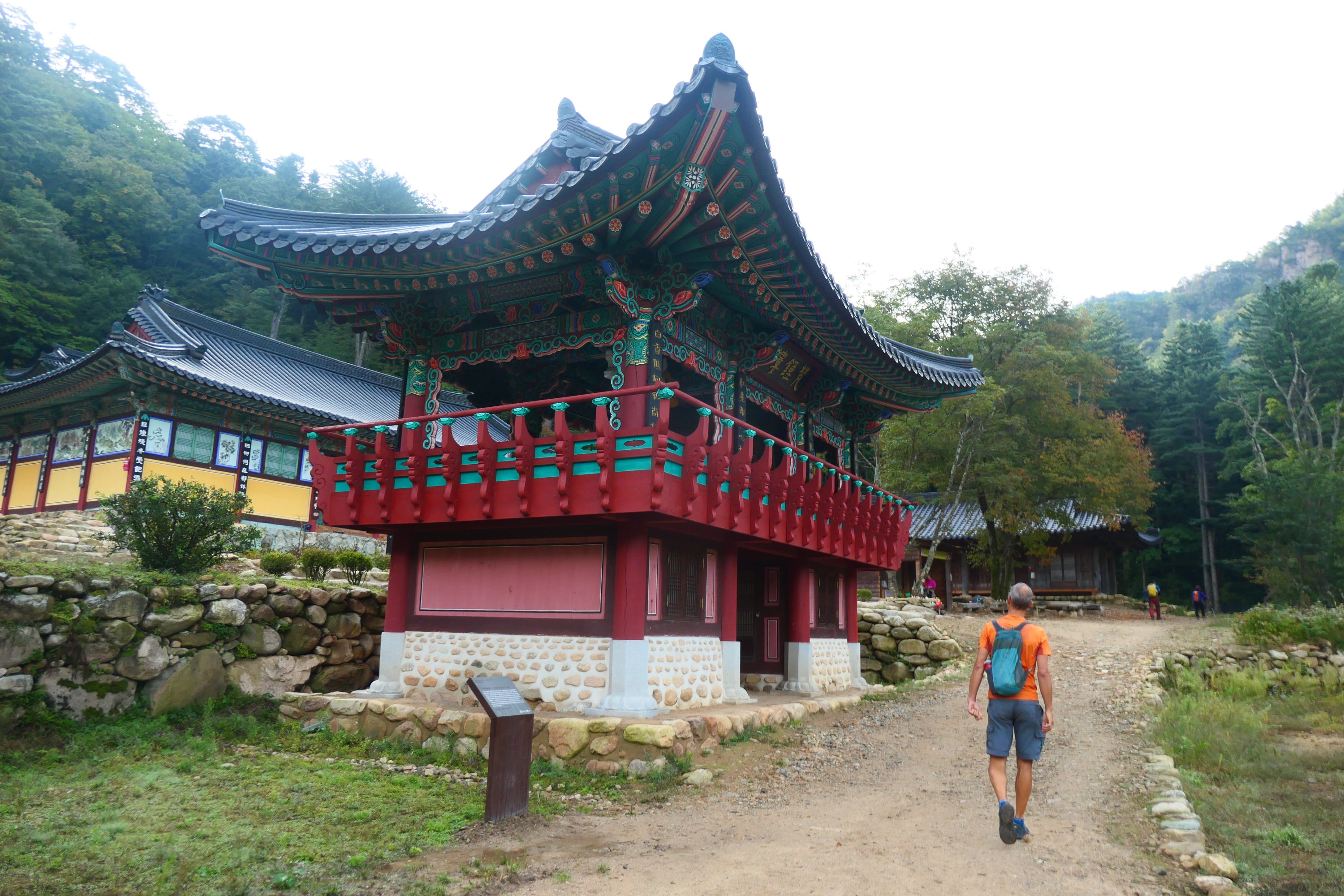 Na het ontbijt gaan we zo snel als mogelijk op pad, want we willen naar de 2e en de 3e tempel wandelen en op tijd terug zijn voor de (altijd gratis tempel)lunch. Voor de wandeling staat 4 uur en 20 minuten en de lunch is om 11:30 uur. Dat is best krap als we de tempels niet willen aantikken, maar bekijken. We gaan met Shi-i op pad. Onderweg hele stromen Koreanen, de meesten minimaal van middelbare leeftijd, in kleurrijke, hippe outfits. De vrouwen flink opgemaakt en wel. Dat moet ook wel in een op uiterlijk gericht, selfie-schietend land! En daar lopen wij dan in onze kleurloze, verschoten kleding en afgetrapte schoenen… Het is geen modewedstrijd, maar we vallen wel héél erg uit de toon. Wordt tijd dat we gaan shoppen!