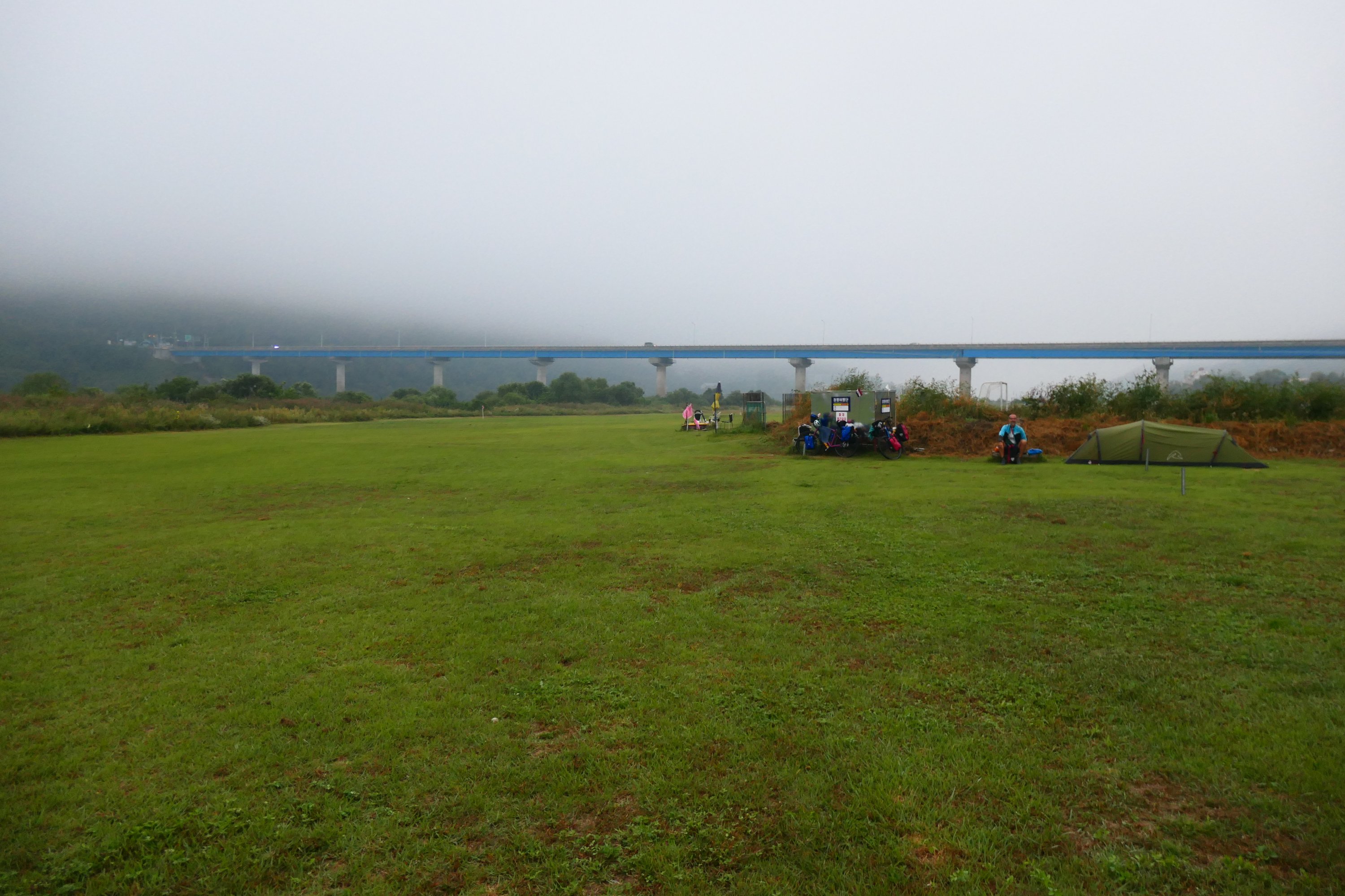 Het nadeel van kamperen… we worden wakker met een zeiknatte tent. Het is niet bepaald zonnig en droog, dus we pakken de tent maar nat op. Aangezien we vandaag Seoul gaan bereiken en dan sowieso dagen niet kamperen, moeten we een lange droogpauze houden. Een goed excuus het rustig aan te doen. En de Koreanen? Die kijken, zien aanleiding voor een praatje en zo leren we Korea steeds een beetje beter kennen. In tegenstelling tot Japan waar we zelden iemand op straat spraken, gaat hier geen dag voorbij zonder een praatje. Super leuk, we voelen ons welkom!