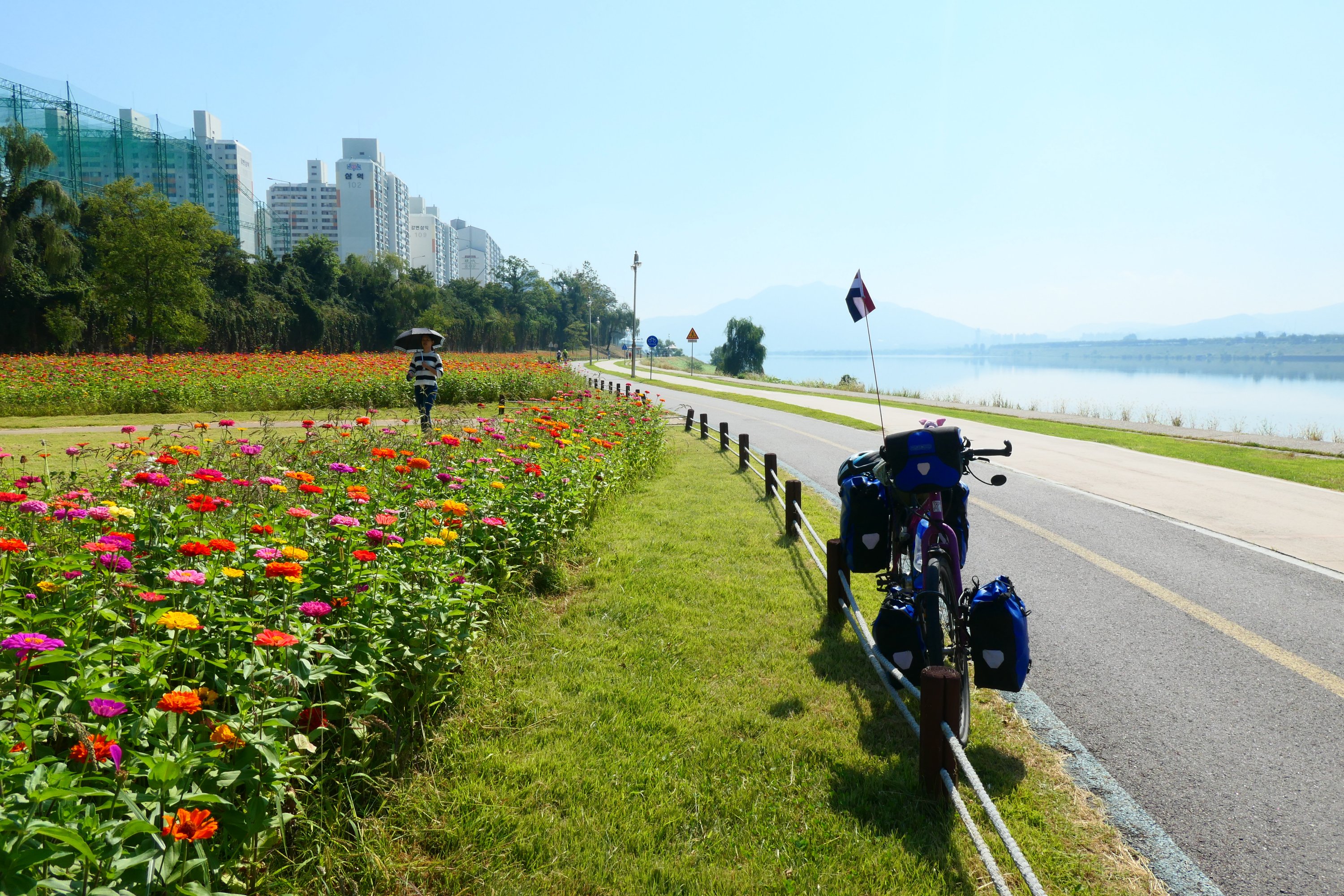 Soms vinden we wel een mooie plek om te kamperen, met een toiletgebouw er naast. Dit maal zijn we superasociaal op een camping gaan douchen. We gingen een kijkje nemen, wilden even checken hoe het met de douches zat en zo stonden we beiden opeens 10 minuten later gedoucht weer bij de fiets. Toestemming vragen had langer geduurd…. Dit onbetaald gebruik maken van betaalde faciliteiten is iets wat door fietsers vaker wordt gedaan en iets wat we volledig afkeuren. Waarom we het dan toch gedaan hebben? Geen idee, het ging zo makkelijk. Even onder de douche, omkleden en gaan. De douches zijn hier overigens gezamenlijk; één doucheruimte, geen privé, net als bij de jjimjilbang.