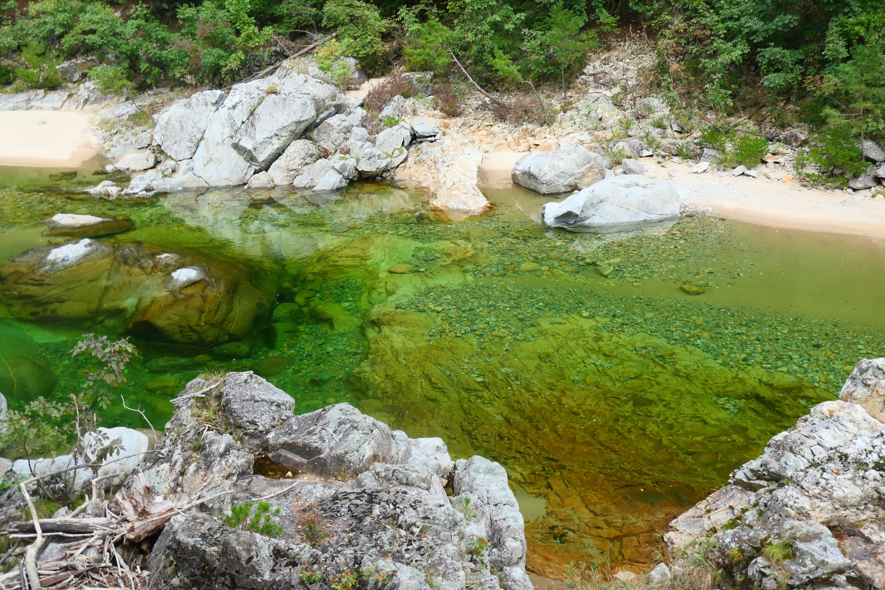 We zetten met volle buiken de verdere afdaling in, tot de afslag naar een wandeling in Seoraksan National Park. Het langdurig tafelen kost ons een deel van de wandeling. Er zijn tijdslimieten voor het betreden van dit nationale park, zodat wandelaars voor het donker terug zijn. Het klinkt bijna Japans; overbezorgd over de volwassene die zonder hulp in zeven sloten tegelijk zal lopen… We mogen 6,5 km lopen tot een tempel en niet verder. Pas als we daarmee akkoord gaan mogen we door. Ondanks dat deze rivierwandeling over asfalt gaat, mag de fiets het park niet in. We laten alles achter, verwisselen de fietsbroek voor een korte broek en kletsen een eind af langs de prachtige, heldere, groene rivier. Het praat toch heel wat beter al wandelend dan hijgend en puffend de berg op fietsend!
