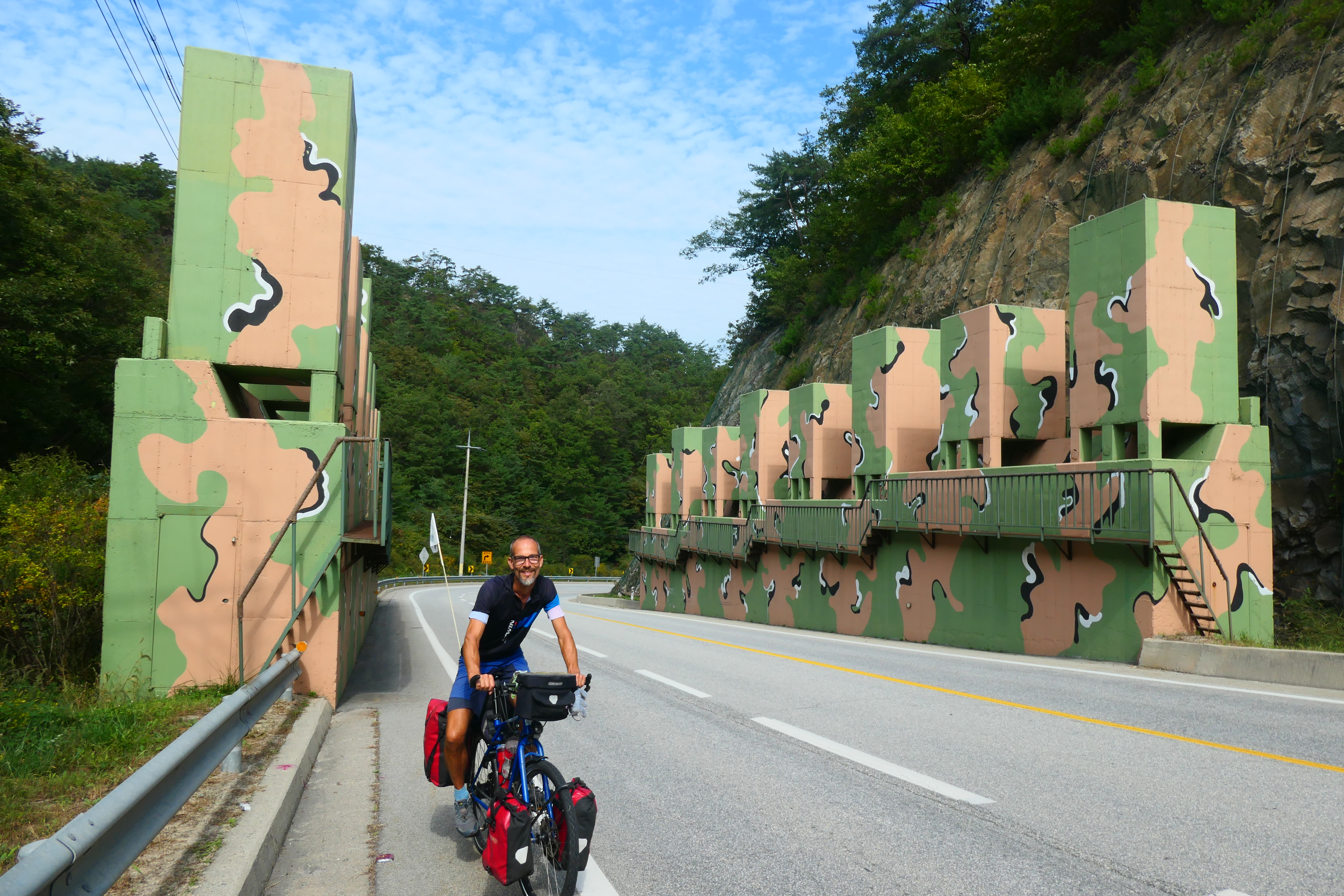 We fietsen de hele route op korte afstand van de grens van de twee Korea’s, waar steeds weer bewijsmateriaal van aanwezig is. Dan weer een tankwagen, bunkers of dikke muren langs de weg, dan weer de peacedam waar alles in het teken staat van vrede tussen de twee landen. Je wordt je steeds weer opnieuw bewust dat die oorlog nooit echt is beëindigd. Het is de zwarte bladzijde in het oh zo mooie Korea waar her en der kunstwerken en muurschilderingen de omgeving opleuken. Ook in de meer afgelopen gebieden als hier, waar geen fietspad en fietsroute loopt. Het is er hartstikke groen en opeens staat er bijvoorbeeld weer een prachtig kleurrijk en mooi gevormd toiletgebouw, wat dus niet alleen voor een praktische stop zorgt.