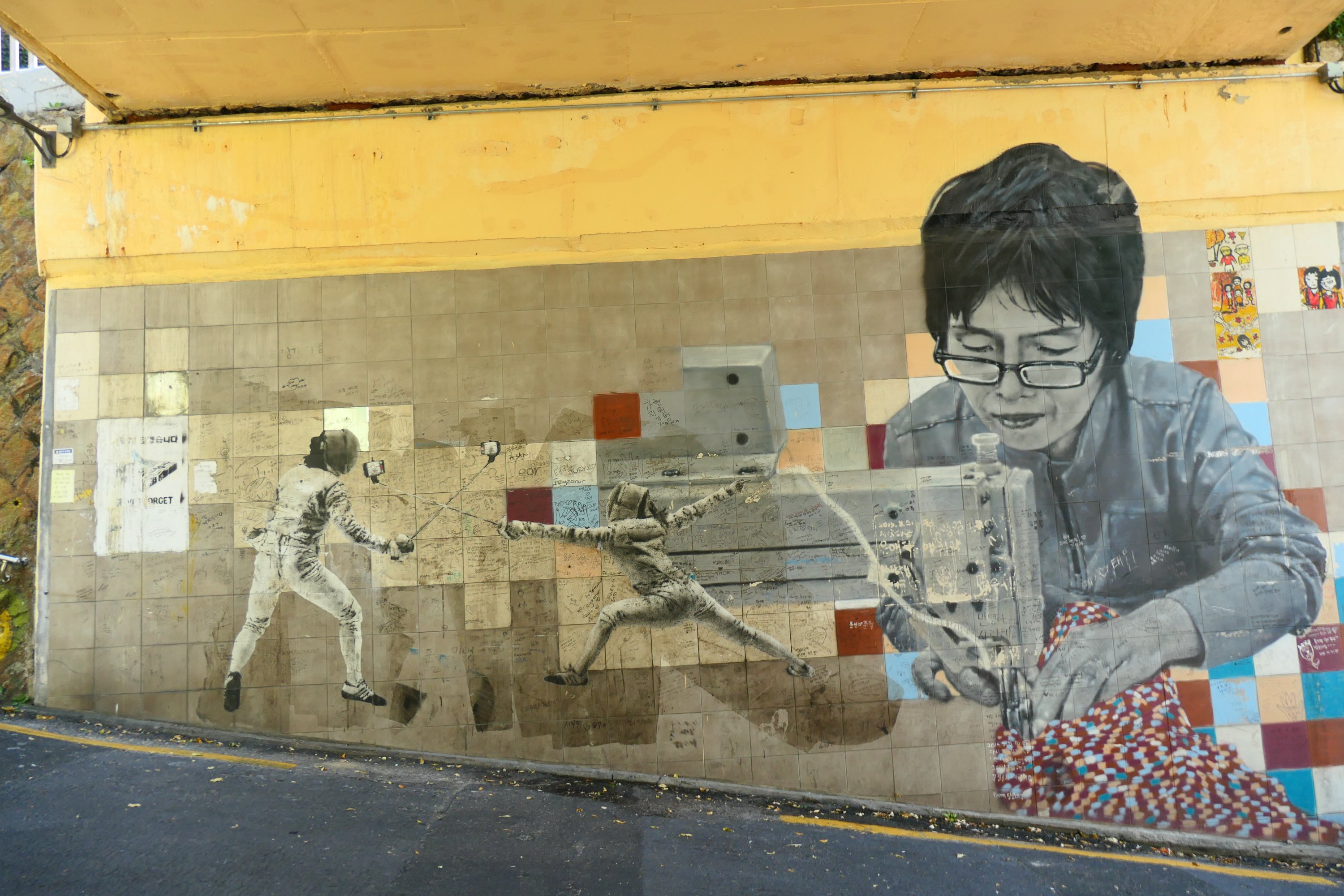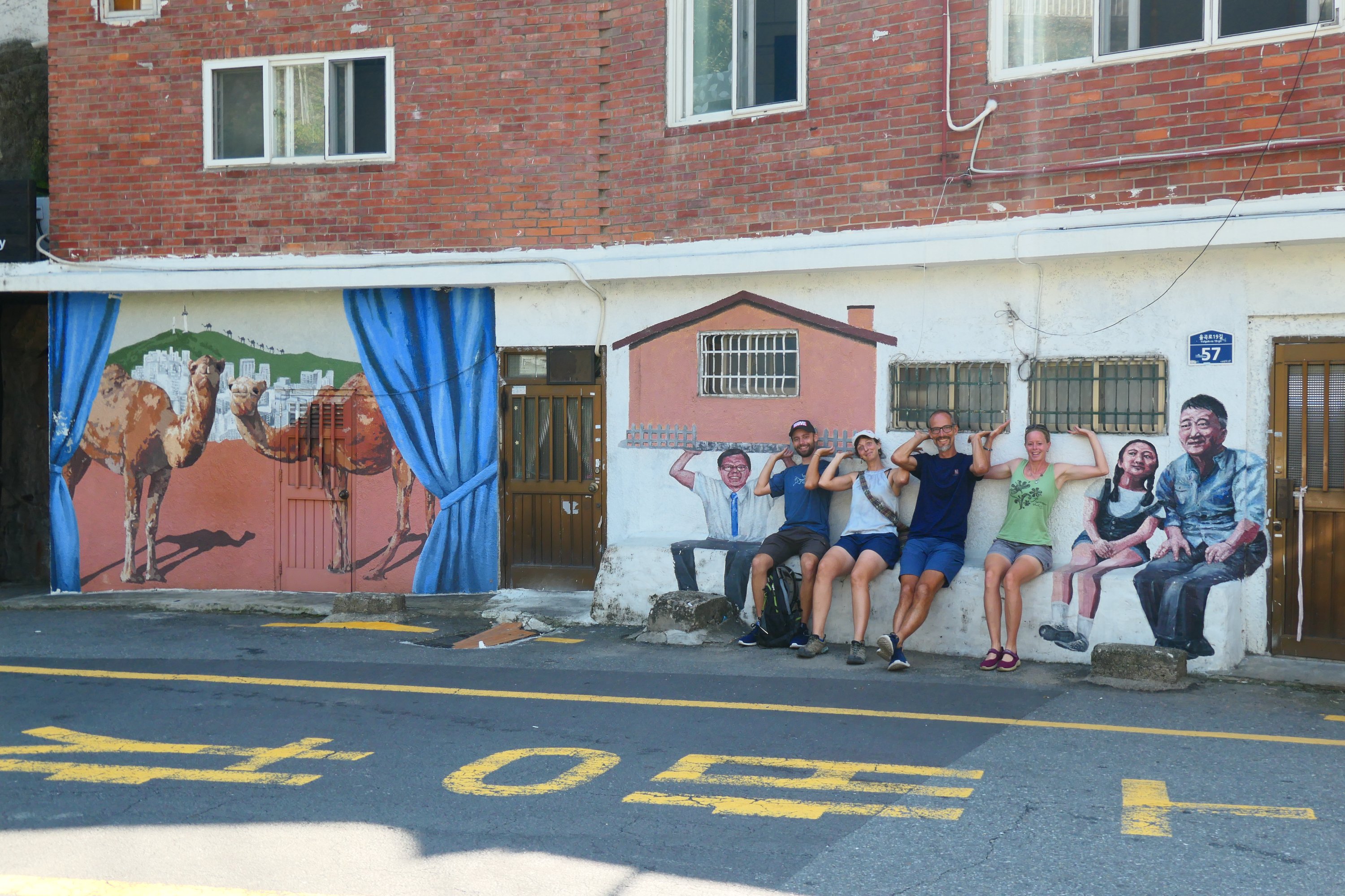 We gaan twee dagen soms samen, soms met z’n drieën en anders met z’n allen op stap. Seoullo 7017 is een plek die we samen ontdekken. Een autoweg met fly-overs, gebouwd in 1970 en in 2017 omgetoverd tot een wandelpromenade met planten, bomen en kunst. Een fijn stukje ontspanning in de grote stad. Aline blijkt prachtig te kunnen pianospelen en kleed de ruimte verder aan met een heerlijk ontspannen muziekstuk. We bezoeken Ihwa mural village, een soort kunstdorp met veel muurschilderingen, gebouwd tegen de oude stadsmuren van Seoul aan. De oude binnenstad van Seoul is strategisch gebouwd tussen 4 heuvels in en door het bouwen van een stadsmuur tussen deze bergen, ontstond een goed verdedigbare stad. Ihwa valt een beetje tegen, of wellicht was ons referentiekader een pittige. Wij hadden gehoopt dat het zoiets was als het overweldigende Gamcheon in Busan, maar Ihwa komt daar niet bij in de buurt. En ach Gamcheon is en blijft ook wel de highlight van Korea, dus probeer daar maar aan te tippen…