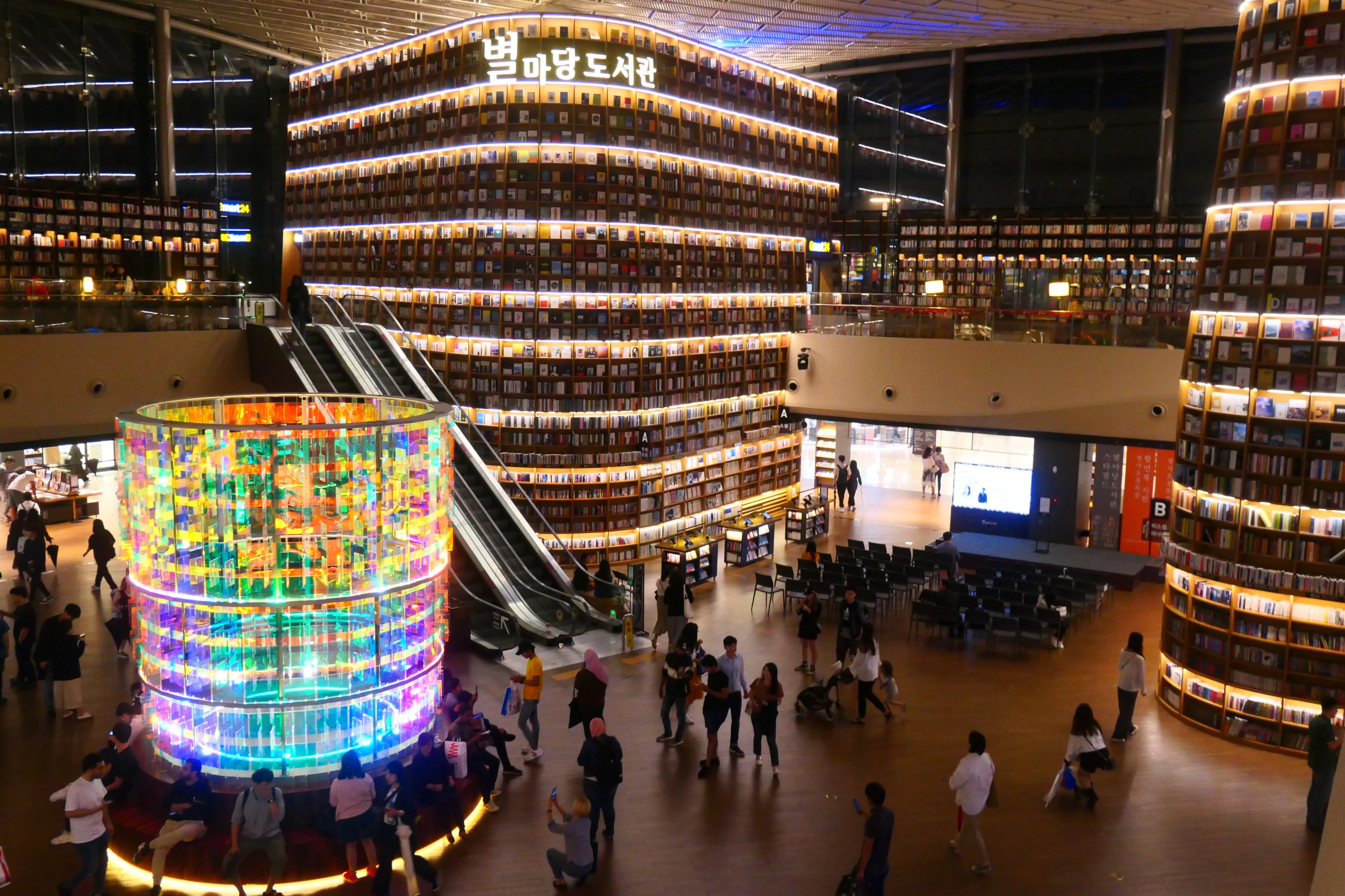 Bij de 3e kliniek hebben we een beter gevoel waar een arts met assistent vertaler de tijd neemt en goed naar de plekjes kijkt. We maken we een afspraak voor vrijdag. Kliniek 2 en 3 (50.000 pp, €75 samen) zitten qua prijs dicht bij elkaar. Ja, ook hier willen ze best direct aan de slag, maar we willen nog even bedenktijd voordat we iemand aan ons gezicht laten zitten. Met deze kennis op zak, laten we onze gedachten bezinken en bezoeken we de grootste toeristische trekpleister in de omgeving: het enorme, moderne COEX winkelcentrum, met een spectaculaire bibliotheek.