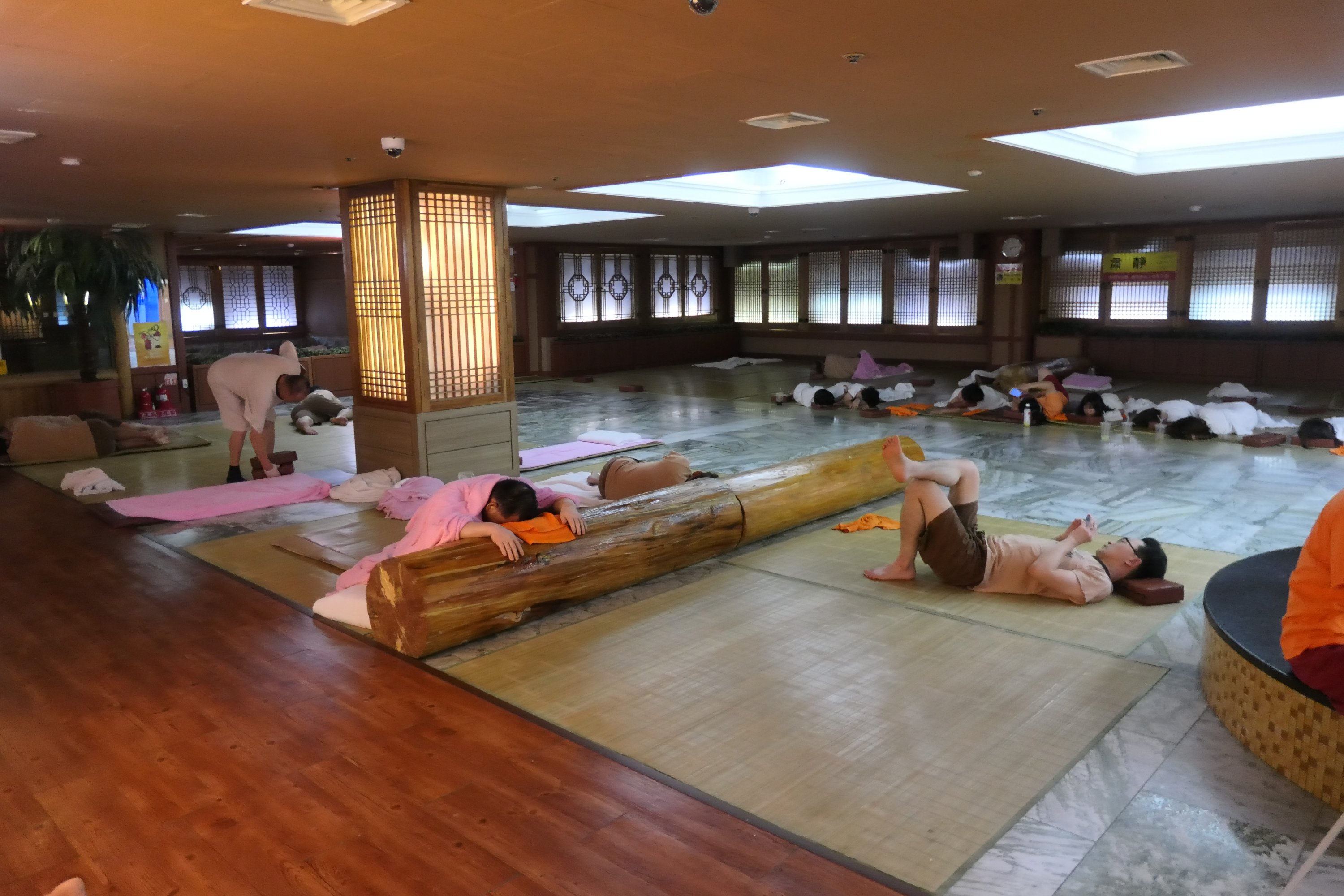 Ons hostel is volgeboekt en dus hebben we een goed excuus voor een bezoek aan één van de vele jjimjilbangs in Seoul. Het luxe saunacomplex annex goedkope, basic overnachting zoals we in Busan reeds van hebben geproefd. Er zijn twee hele bekende jjimjilbangs: Dragon hill spa en Siloam, we kiezen voor de laatste. We laten –wederom– de meeste bagage in ons hostel achter, zodat we met één tas ons kluisje vullen. Ook hier krijgen we bij binnenkomst handdoeken en een kledingpakje. Voor de mannen een bruin pakje, voor vrouwen oranjerood. Het badderen in de diverse warme tot hete baden en het douchen gebeurt uiteraard naakt en, het is immers Korea, mannen en vrouwen gescheiden. Dit complex met 6 etages heeft voor iedere sekse een aparte etage voor het badderen. Vervolgens zijn er nog 4 verdiepingen gemeenschappelijke ruimtes waar je kan relaxen, gamen, eten of drinken én kan slapen. Hier vind je opnieuw een aantal sauna’s. Dit zijn sauna’s van 50 of 60 graden met verschillende thema’s, waar je gekleed en gemixt in gaat. Er is een zout sauna, een loess sauna en een jade sauna. Uiteraard proberen we die sauna’s ook, maar 50 of 60 graden is toch wel erg heet onder de voeten en te zweterig in ons schone slaapkostuum. Dat sommige mensen in die sauna’s gaan slapen begrijpen we totaal niet!