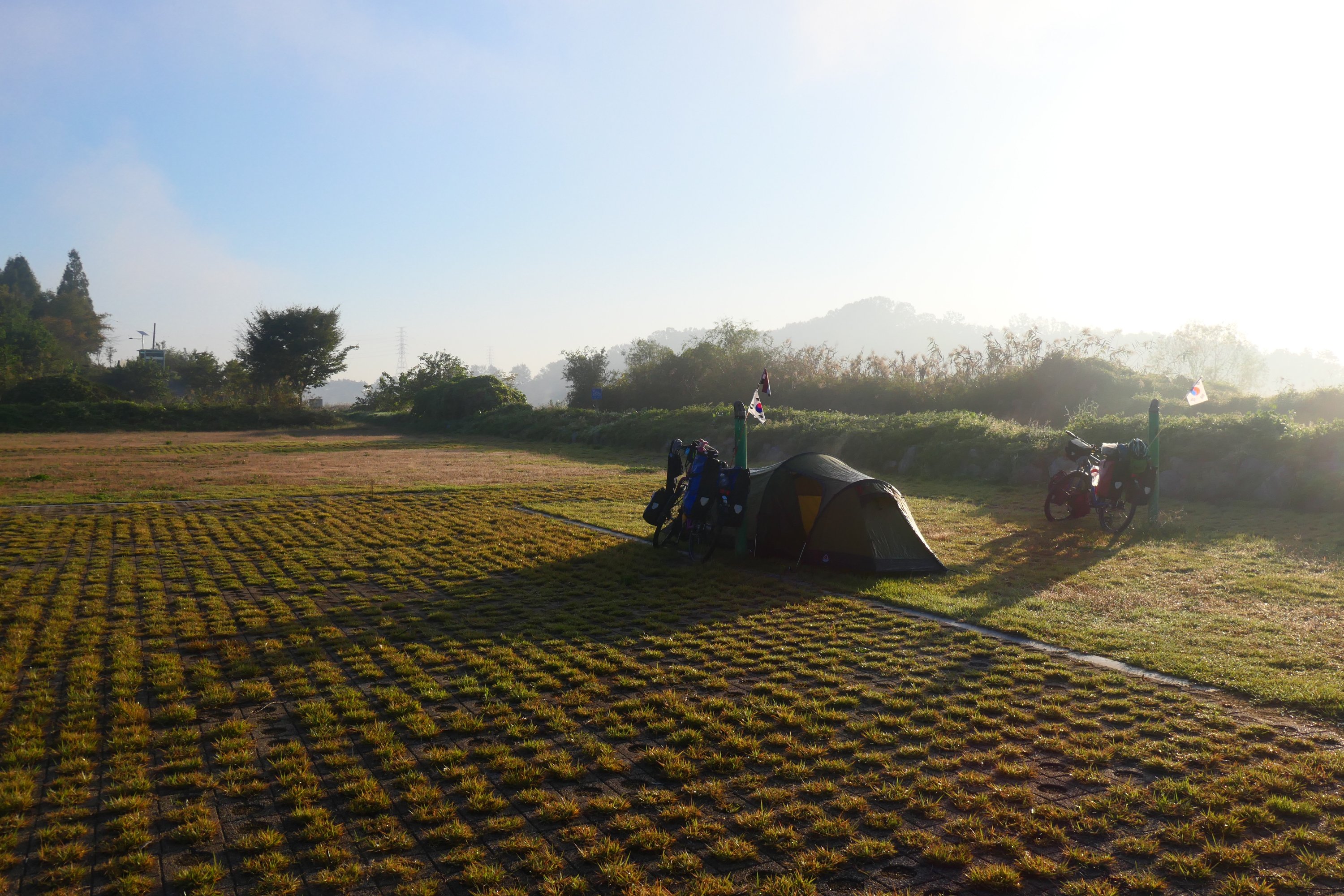 We fietsen een stuk op met een Koreaanse fietser die in 4 dagen van Seoul naar Busan fietst. We komen vaker fietsers tegen die één van de rivierenroutes van een paar honderd kilometer in een paar dagen willen afvinken. We zien het als de prestatiedrang van de Koreanen; als je fietst, dan moet het een heuse fietstocht zijn. Deze fietser met een buikje en gloednieuwe fiets geeft het vermoeden dat (ook) hij niet vaak fietst. De fietser geeft ons een snoepje die we beide zo in de mond stoppen. Wat hebben we nou geleerd over snoep aannemen van vreemden…??? Hij blijft een tijdje voor ons fietsen en ons in de gaten houden. Dan komt hij naast ons fietsen en met gebrekkig Engels voeren we een redelijk gesprek tot we bij een supermarkt afslaan. Hij fietst door. Als we juist weer opgestapt zijn, staat hij weer voor ons. Hij raadt ons voor de overnachting een tentveldje op een klein eilandje aan. Hij heeft zelfs alvast polshoogte voor ons genomen. Het is een prachtige plek en het is een mooie tijd om de tent op te zetten, al wilden we eigenlijk nog wat verder. Alhoewel… in een halve dag hebben we reeds 80 kilometer afgelegd en het begint te schemeren. Is het wel verstandig om zomaar zijn adviezen aan te nemen? Eerst een verdovend snoepje… dan op een verlaten eilandje kamperen… Is dat wel zo verstandig?…