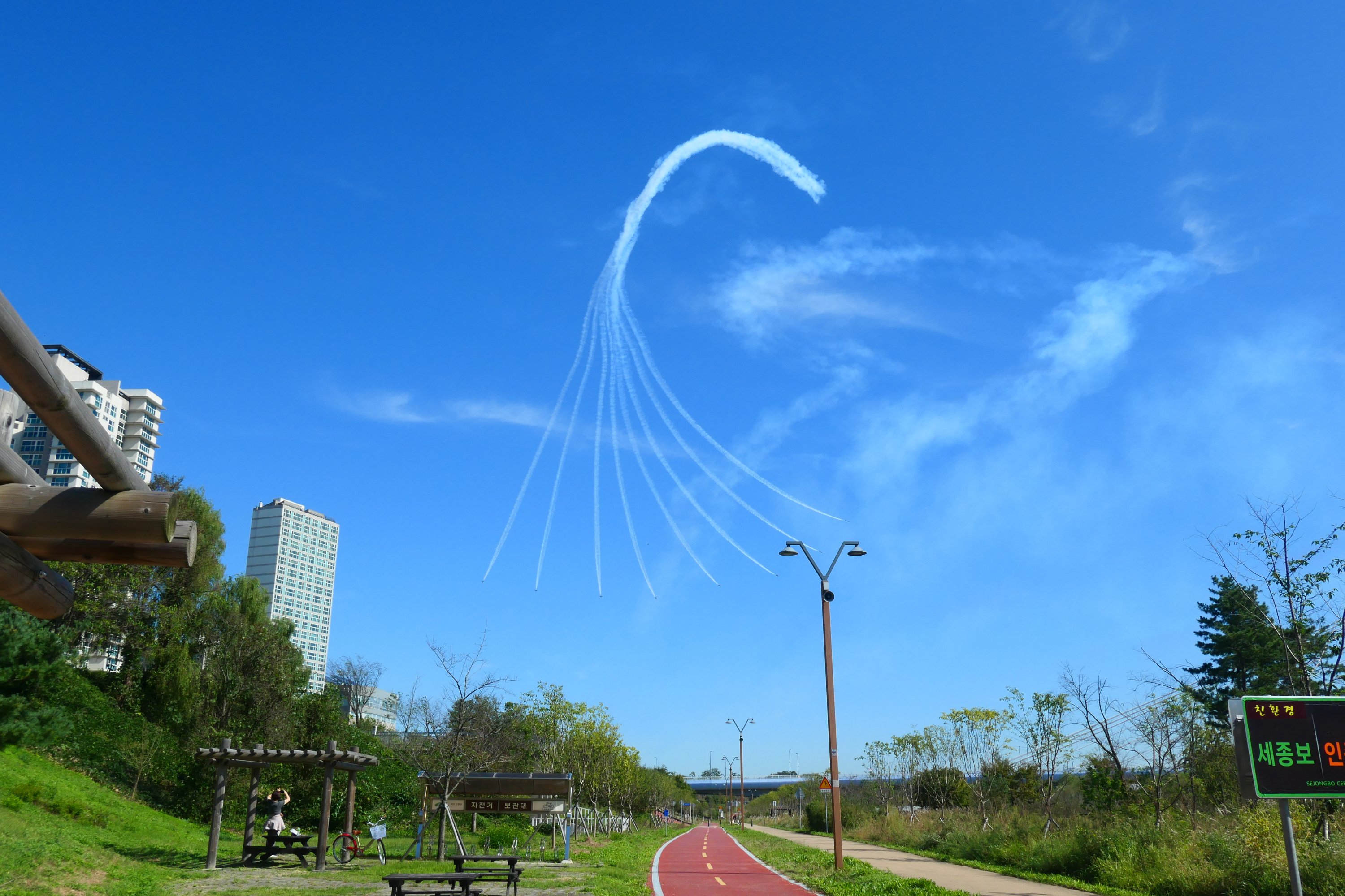 Een stempelpost verder gebruiken we om de tent uit te hangen en te drogen en een tweede ontbijt. We zijn alweer 3u en nog geen 10 km verder na het eerste ontbijt. Het zonnepaneel gaat uit, we checken een supermarkt en de tijd vliegt. Als we willen gaan, worden we opgehouden door een (oefening voor een) straaljagershow. Super grappig en leuk om te zien, zo vlak boven de stad.