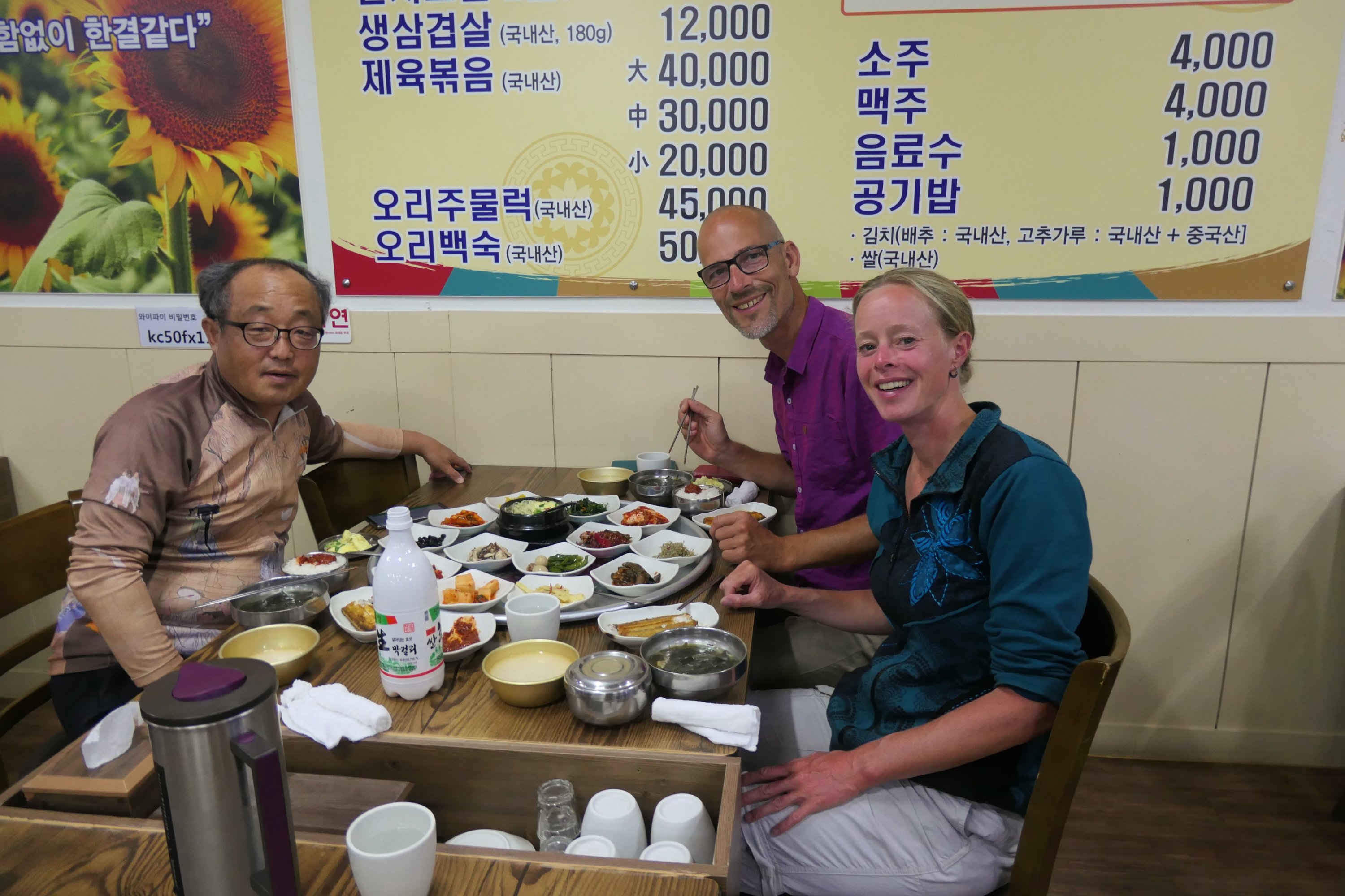 We fietsen langs een rivier met tegenwind. Net als bijna alle dagen in Korea. Bij de lunchpauze om 14:00 is het tijd ook de matjes en slaapzakken te zondrogen. We bakken en koken ondertussen verse eitjes en genieten van de lunch. Deze pauze neemt wederom een uur in beslag. Wat een trage dag met meer pauzetijd dan fietstijd! Een fietser komt langs en trakteert ons op een stuk of 10 mini-appeltjes. Zo groot als aardbeien met in het midden een pit. Ze zien er niet uit, maar smaken heerlijk! Als we vertrekken vraagt een andere fietser welke kant we op fietsen; dezelfde als hij gaat. Hij vraagt waar we slapen en geeft tips voor wildkampeerlocaties. Even later vragen we ons af waar de vraag eigenlijk vandaan komt. Dan komt hij aanfietsen. Chang spreekt erg goed Engels en vertelt in Nederland te hebben gewoond en gewerkt. We kletsen een eind af tot hij aangeeft in een motel te slapen boven een heerlijk restaurant. Voor dit eten fietst hij 115 km. En… morgen 115km terug! Als wij in hetzelfde motel gaan slapen, neemt hij ons mee uit eten….! Het motel kost 35.000 won, wat heel netjes is, dus we overwegen het. Het aanbod is erg verleidelijk. Zonder dat we volmondig ja hebben gezegd, heeft hij al besloten voor ons. We fietsen naar het motel, hij regelt dat alle fietsen binnen kunnen en een half uur later zitten we te smullen. Een hoofdmaaltijd van 3 schaaltjes rijst, soep met zeewier en slakjes en ei. Daarnaast 13 bijgerechten (o.a. paling, gedroogde visjes, kwarteleitjes, pompoen en natuurlijk kimchi). Hè vervelend allemaal, weer niet wildkamperen 😉