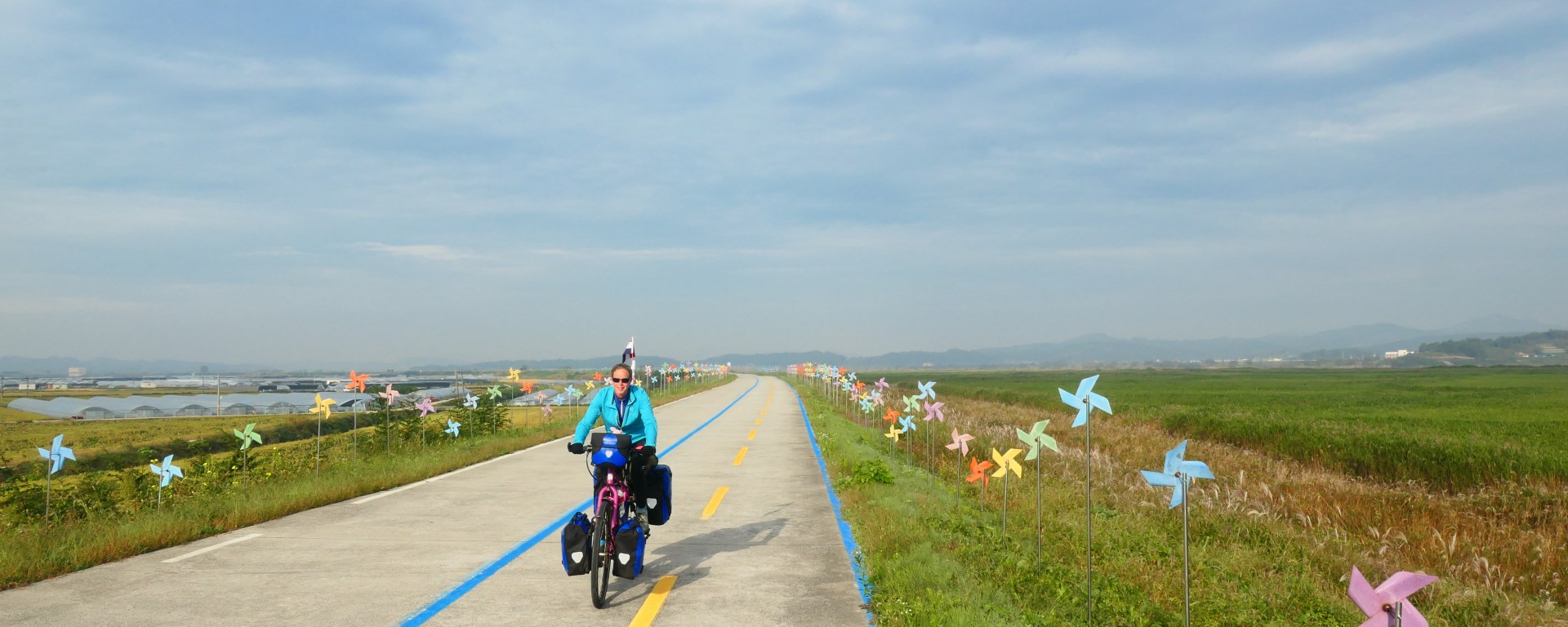Het is een beetje een grauwe dag vandaag, maar we hebben een hoogtepuntje te vieren: er staat 23.000 km op de teller! Onderweg fietsen we over een dijk met kilometers lang plastic windmolentjes langs de weg. Wat een kleurrijk, vrolijk geheel toch weer; Korea viert met ons mee;). Zuid-Korea blijft dag na dag aangenaam verrassen met leuke en mooie dingen!