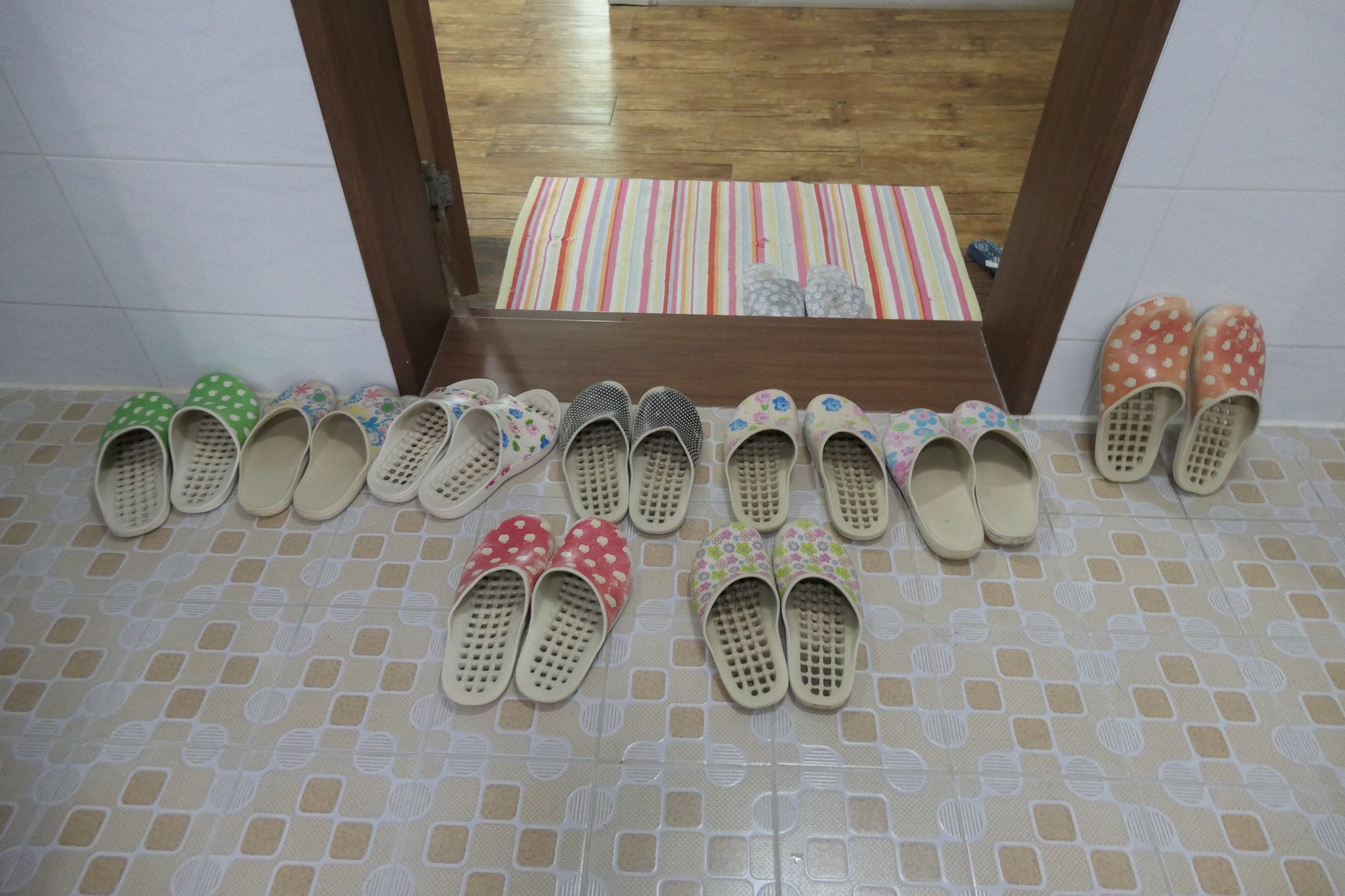 We starten met de focus op onze ademhaling. Het gaat redelijk. Ik vraag me af hoe het met Auke aan de andere kant van de zaal gaat. Hop focus weg. En zo vliegt de focus van ademhaling naar gedachten naar ademhaling en naar de rest van de cursisten. De ochtend vult zich met 5 uur mediteren afgewisseld met een lekker ontbijt en heerlijke lunch. Tussen elk uur hebben we 10 minuten pauze. Deze 10 minuten zijn net genoeg om de afstand naar de wc af te leggen, iets te drinken en weer op je eigen genummerde kussen in de zaal plaats te nemen. Niet dat de afstand zo groot is. Korea heeft net als Japan vertragende gewoontes omdat schoenzolen vies zijn… In de meditatiezaal loop je op sokken (de meeste dames) of op blote voeten (de meeste mannen). Om naar de wc te lopen trek je dus eerst je schoenen aan (en jas op deze vroege, koude ochtend!). Bij het woongedeelte aangekomen moeten de schoenen voor de drempel uit en doe je slippers aan. Daarmee kan je de 3 meter tot de badkamer afleggen. Daar wissel je je slippers om tot badslippers. En terug doe je dat allemaal nog een keer. Dus je hebt 10 minuten om 5x je schoeisel aan en uit te doen en 2x 150m af te leggen. Als je tijd hebt kan je nog even plassen, daar waar je voor aan de wandel was gegaan.