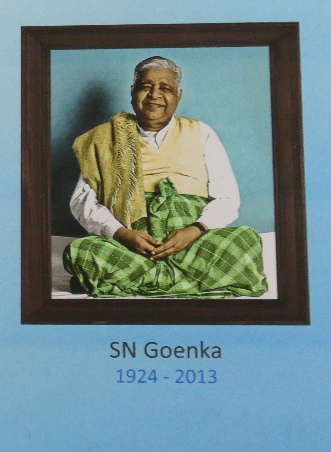 Elke avond om 19:30 uur luisteren en kijken we 1,5 uur naar een interessante seminar van wijlen S.N. Goenka. Hij komt uit Myanmar waar hij de Vipassana meditatie heeft geleerd. Deze heeft hij vervolgens vele jaren in India onderwezen. Hij spreekt goed Engels met een flink Indiaas accent. Hij praat graag met een krakende stem en gebruikt woorden (Engels en Sanskriet) die ik niet allemaal ken. Het kost moeite goed te concentreren, wakker te blijven en alles mee te krijgen. Om me heen zitten 31 Koreaanse vrouwen de ondertiteling te lezen en twee dames hebben een headset met vertaling. Ik vermoed dat ze meer meekrijgen. De boodschap is: balans van body en mind. En ik kijk naar Goenka die obees onderuit gezakt met stralende ogen vertelt. Obesitas en balans vind ik een uitzonderlijke combinatie. Als vervolgens om onverklaarbare reden zijn -naast hem zittende- vrouw in beeld komt, raak ik nog meer afgeleid. Ze zit als een zak zout ongelukkig voor zich uit te staren. Wat doet deze anti-reclame in dit filmpje???