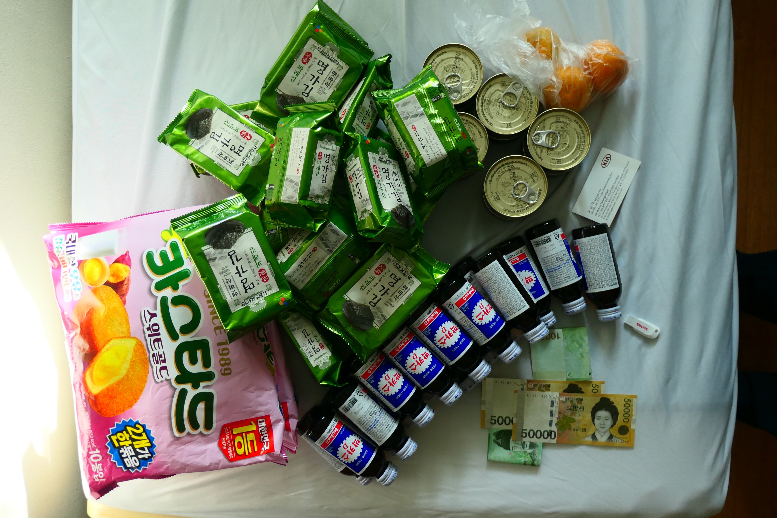 Ohja, om een beter beeld te geven van de enorme stapel typisch Koreaanse giften, we hebben ze even op een rijtje gelegd en geteld….: 20 Vit.D-drankjes, 16 pakjes zeewier, 10 blikjes zalm, 2 megaverpakkingen met 10 cakejes, 3 mandarijnen, insect repellent, digitale foto’s en alsof dat niet genoeg is daarbovenop W120.000.