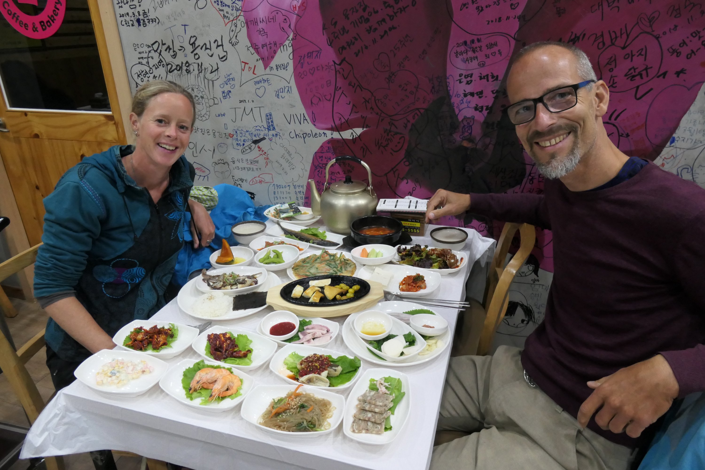 We zien deze maaltijd als een gift van Sung-Jae You die ons bij de Vipassana opwachtte en ons, naast allerlei lekkers, zowaar geld gaf voor een maaltijd. De maaltijd was voor ons doen relatief duur; 38.000 won, (€30,-). Wat in Nederland met al die chique gerechtjes natuurlijk een koopje zou zijn… We verwennen onszelf hiermee, leren na 7 weken Korea nog steeds nieuwe gerechten en toasten op een geslaagd Zuid-Korea. Nog een paar dagen en dan verlaten we dit heerlijke land.