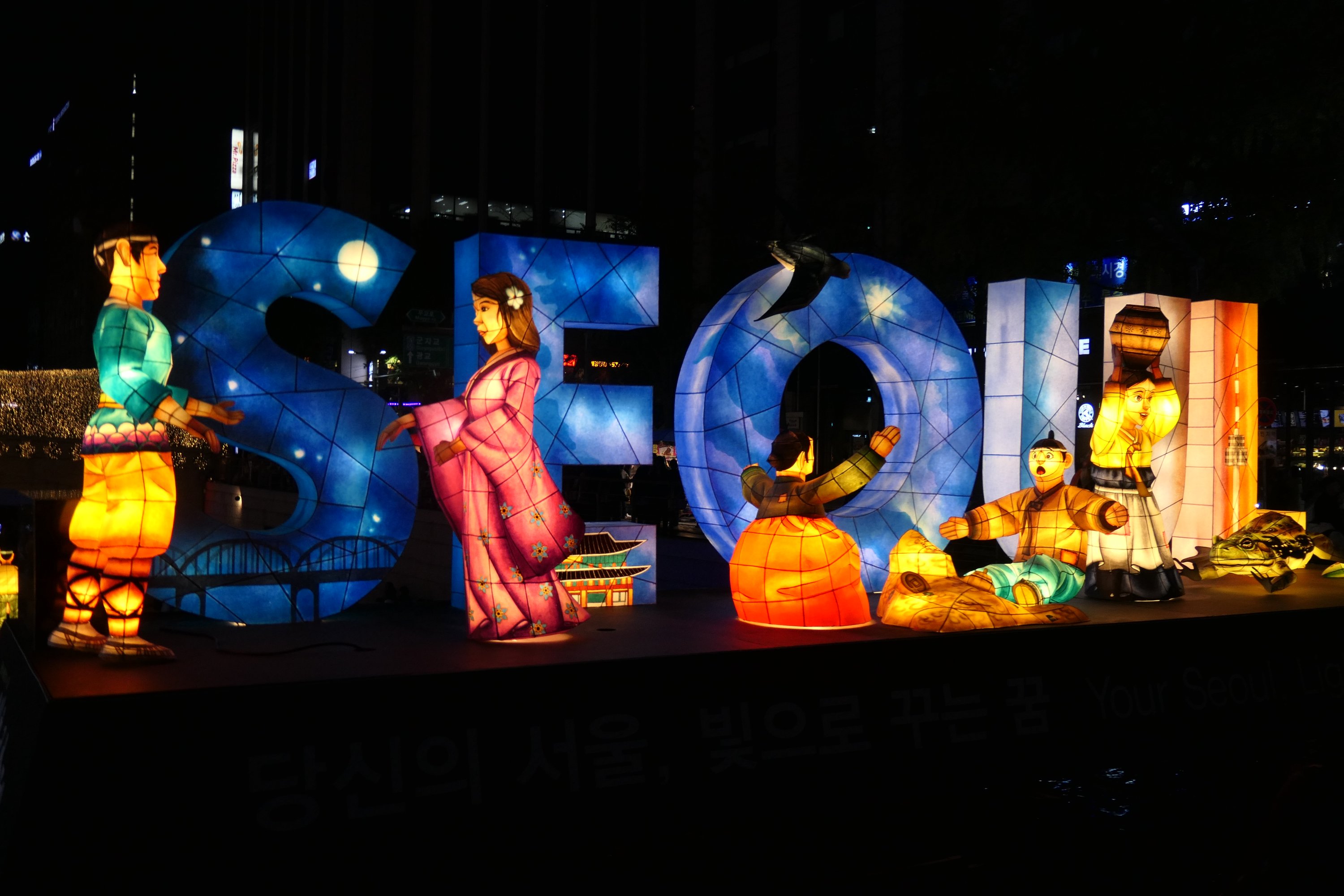 We hebben Korea bijna helemaal rond gefietst, met zo’n 2.000km op de Koreaanse teller. We vinden het niet nodig dezelfde route terug te fietsen, dus pakken we net als van Mokpo naar Jeonju, de bus. Timewise wel zo efficiënt. Na een busrit van geen 3 uur maar 4,5 uur komen we aan in Seoul. Het is al donker als we door de inmiddels vertrouwd aanvoelende stad aankomen in ons hostel. De belangrijkste bezienswaardigheden hier, hebben we al bezocht. De voornaamste reden om terug te komen naar Seoul is, naast de overtocht naar China, het lantaarnfestival. Dit festival wordt jaarlijks georganiseerd in november. Lantaarns van gebouwen, beroemdheden, dieren en sprookjesfiguren sieren de Cheonggyecheon rivier op. Het is sfeervol en natuurlijk wordt er uitgebreid gegeten. We genieten ervan, al zijn we niet zo onder de indruk als de rest van Korea.