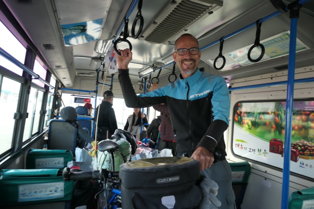 We mogen de fietsen gratis mee de boot opnemen, op voorwaarde dat we hem zelf aan boord brengen. Geen probleem. Dachten we. We fietsen bij voorkeur altijd graag zelf de fiets de boot op. Alleen onlangs toen we Jeju verlieten liep het anders. We waren erg laat, het autogedeelte was gesloten en de fietsen moesten de trap op worden gesjouwd. Hier waren we heel vroeg (9.30 uur bij vertrek om 12.00 uur), desondanks is er geen sprake dat we a. naar de boot fietsen vanaf de terminal en b. de fietsen het autodek oprijden. Dus moeten Knorretje en Iejoor de hoge persoonsbus in en uit en daarna de lange trappen omhoog de boot in. Grrrrr….. Praten als Brugman levert niets op. Regels zijn regels en geen ruimte voor makkelijkere, snellere en prettigere alternatieven…