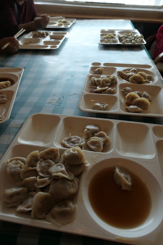 De boot kost met onze privé kamer en alle belastingen (die komen er net als bij het vliegen over heen) €111,- per persoon. Voor dit geld krijgen we alle maaltijden inbegrepen. Woooohhh, luxe! Lekkerrrr, buffet! Wat had ik gezegd over verwachtingen…? Juist ja. De 600 Chinezen en wij moeten de hele boot door kronkelen om een wachtrij te vormen voor het restaurant. We hebben per eetmoment één uur de tijd waarin iedereen eten dient te halen en op te eten. We krijgen heerlijke dumplings. Een oud, vies uitziend plastic 6-vaksbord (op zijn Koreaans) die met een bord wordt volgesmeten met dumplings. Een bord vol dumplings is saai en niet zo lekker meer na de 8e, , 9e , laat staan de 10e dumpling. We kiezen samen al nooit hetzelfde gerecht en in Korea werden we enorm verwend met 6-20 bijgerechten… Nu eet je gevulde deegbal na gevulde deegbal. Ach de avondmaaltijd, het ontbijt en de tweede lunch bevatten tenminste 3 dingen op je bord; rijst, vlees en een heerlijke vleesvervanger.