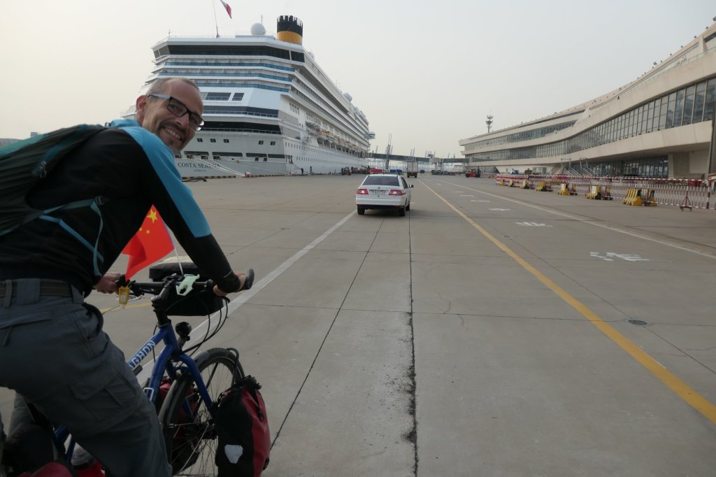 Bij aankomst mogen Knorretje en Iejoor op dezelfde manier de boot af; traplopend naar beneden. Dit keer mogen we als eerste in plaats van als laatste. Beneden aangekomen geeft een buschauffeur duidelijk aan niet op de Koreaanse vlag op onze fietsen gesteld te zijn en gebaart deze weg te halen. Hij komt direct met de Chinese vlag aanzetten. En nog één, zodat beide fietsen voorzien zijn. Een politie-auto die ons zal escorteren staat klaar en de agent vindt dit blijkbaar een belangrijk proces en gebaart mee te gaan als de Koreaanse vlaggen daadwerkelijk weggemoffeld zijn. Achter hem aan naar de douane, de douane door en dan zijn we in China! Het is even spannend. De douane beambte stelt mij vragen over hoe lang ik wil blijven, waar we heen gaan etc. Ik begin eerlijk met ‘2 maanden’, waarop ze aangeeft dat mijn visum 1 maand geldig is. Dat ik die ga verlengen geeft haar een wat meewarige blik. En dan bedenk ik dat we bij de aanvraag van het visum –naar waarheidsgetrouw- iets moesten verzinnen qua route etc. Toen gaven we Beijing aan voor 1 maand Chinese les. Dus roep ik dat nu ook maar. Alleen Beijing???? Nou ja en omgeving. En daarmee vindt ze het wel best en laat me gaan, Auke heeft Iejoor allang weer opgetuigd en kwam zonder vragen de douane door. We zijn binnen! China, we hebben er weer zin in!