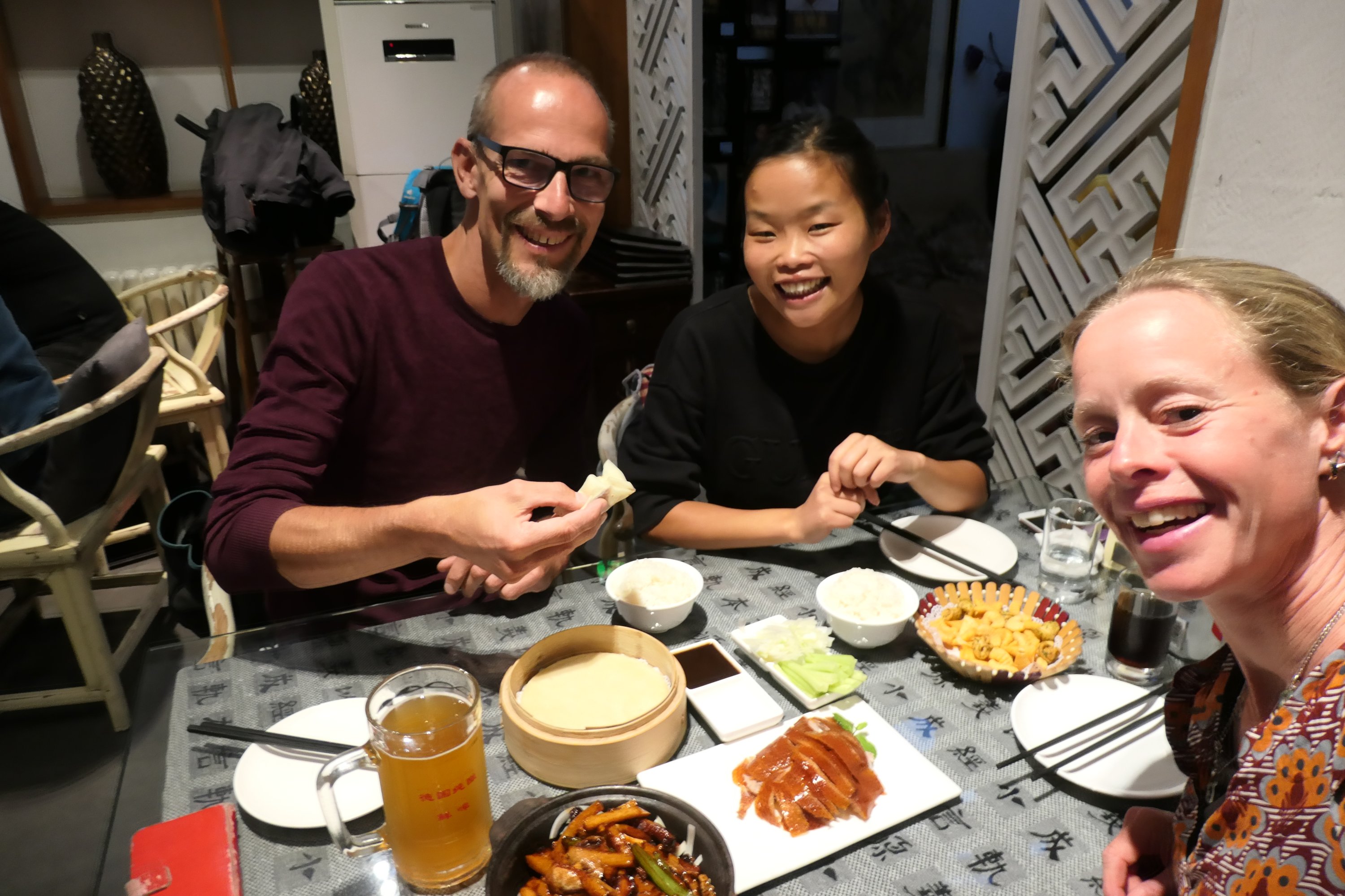 Tegen 20.00 uur komt Ying thuis. Ze is een heerlijke bron aan energie, ondanks een lange werkdag praat ze honderd uit. We nemen haar mee uit eten. Peking eend, natuurlijk! Gelijk met de deur in Beijing vallen, hoe beter kun je deze stad beginnen?! Peking eend eet je als volgt. Kleine stukjes eend, wat groente en saus leg je op een mini pannenkoekje die je opvouwt tot een smaakvol pakketje. En dan proberen zonder stokjes en zonder te knoeien op te eten. En nog tig keer, hmmmmm… lekker! We kletsen en drinken tot een uur of één, tot iedereen bijna omvalt van de slaap.