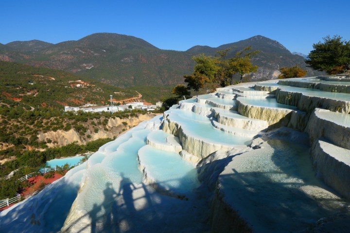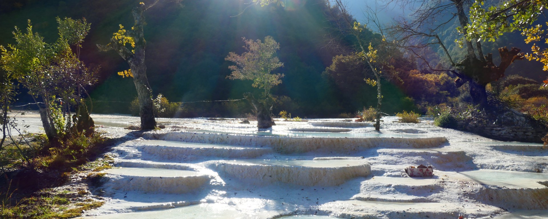 De kalksteenterrassen zijn een prachtig natuurlijk fenomeen en zien we als de Pamukkale van China. Echter de Chinezen helpen de natuur graag een handje. Ze hebben –hoe teleurstellend!- onderaan de natuurlijke kalkterrassen, betonnen bakken gemaakt en leiden daar het kalkrijke water langs. Over een paar jaar zullen hier dus mooie, gemaakte terrassen zijn. We lopen snel door. Mede omdat het zonlicht de laatste terrassen nog maar net verlicht, al is het 15.00 uur. Wat een bijzonder mooi fenomeen is dit. We hebben allebei Pamukkale in Turkije gezien, maar dit is waarschijnlijk nog mooier. Witte kalkterrassen en emerald blauwe waterpoelen tegen een achtergrond van groene bergen en rood zand. En ook dit is weer gewilde locatie om trouwfoto’s te maken. Dat snappen wij wel!