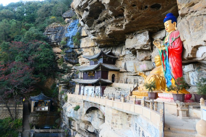 Een kilometer of 15 voor Shaxi bezoeken we het Baoshan tempel complex, o.a. beroemd vanwege zijn grottoes: in rotsen gehouwen reliëfs en beelden. De omgeving is heel mooi, met prachtige uitzichten en hier en daar makaken. We hebben helaas te weinig tijd om rustig rond te kijken en zijn een beetje verzadigd van tempels. We vinden het het geld niet echt waard (26 euro voor entree en ‘verplichte’ shuttlebus). En balen dat het sinds kort verboden is zelf rond te fietsen en via de andere zijde Shaxi in te fietsen. Dat was immers ons plan…
