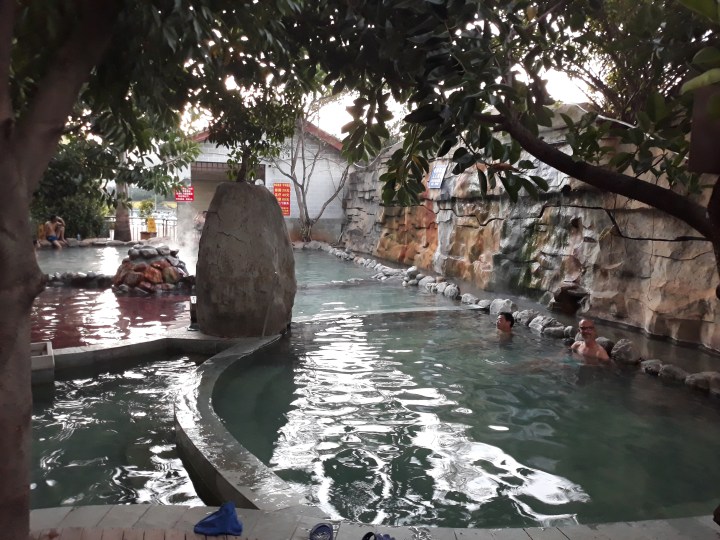 Voor Y100 borg krijgen we sleutels voor de kluisjes en worden we door de badmeester naar onze kleedkamers verwezen. Was ik nog maar even naar het toiletgebouw geweest… hier mag ik op mijn BLOTE voeten naar een open ruimte met twee squad wc’s… De gezamenlijke doucheruimte is een drukte van belang. De douche bestaat uit een enkele straal water. En dan mogen we de baden in, vier buitenbaden met verschillende temperaturen en één rood bad. Of dat natuurlijk is of niet, is de vraag. Of het echt een hot spring is, natuurlijk ook. Het grappige is dat ik niet alleen als mzungu opval, ook een bikini is niet bepaald gebruikelijk. Zelfs een Hollands zwempak zou dat niet zijn. Een Chinees zwempak is meer een strakke mini-jurk voor in het water. Ongegeneerd kijken de dames en heren naar ons. Later ben ik van de warmte zo rood aangelopen dat het de vraag is of er nu over me gesproken wordt vanwege de witte huid of rode kop 😉 oh en ik verbeeld het me niet hoor, ze kijken en praten openlijk over je. Schaamte? Daar doen ze hier niet aan.