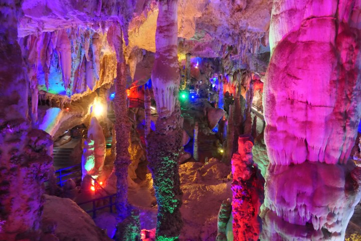 Jiuxiang Scenic Area is een immens grottenstelsel, gevormd door rivieren in karst rotsen. Voordat de rivier de grotten induikt, wurmt deze zich nog door een smal ravijn, waar onze wandeltocht begint. Het is zonder meer een grot bezoeken op zijn Chinees: er is een lift die je 50m naar beneden het ravijn in brengt, de paden zijn smetteloos, overal zijn voorzieningen (winkeltjes, wc’s en zelfs rookruimtes) en de rotsformaties zijn in discokleuren verlicht. Dit is absoluut niet zoals wij in Europa gewend zijn. Daar waar (over het algemeen) getracht wordt, alles zoveel mogelijk puur natuur te houden.