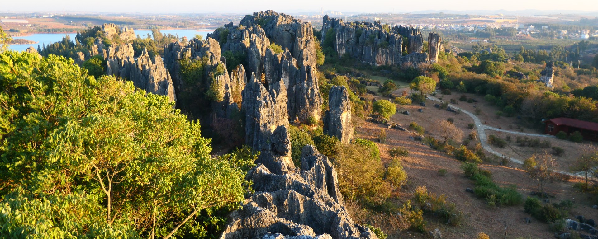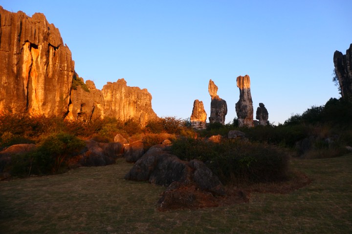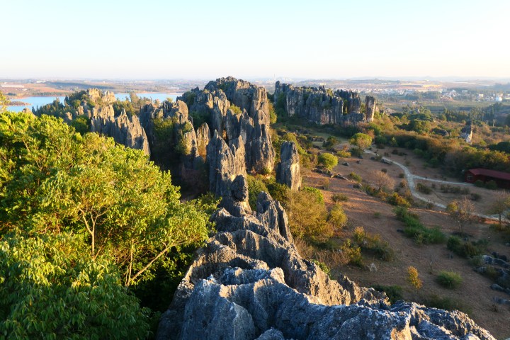 Het is een kilometer of 30 fietsen naar de volgende bezienswaardigheid van vandaag: Naigu Stone forest. Dit is geen versteend bos, maar een verzameling bizar gevormde kalksteenrotsen. Een beetje à la Cappadocië of Meteora. Deze prachtige rotsen hebben zich onder de grond en door invloed van grondwater gevormd en zijn door verschuivende aardplaten naar de oppervlakte geduwd. Hierdoor zie je nu in voornamelijk vlak landschap vreemde, puntige rotsen die uit het niets lijken te zijn komen.
