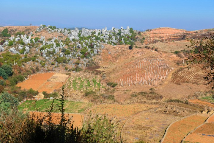 We zitten met ons hotel op de rand van het Stone Forest van Shilin. We zien de puntige rotsen langs de weg en besluiten een poging te wagen het park in te komen. We slechten wat (halve) barricades, maar uiteindelijk staan we toch voor een entree waar kaarten kopen onvermijdelijk is. De entreeprijs is afgelopen jaren van €30,- naar €20,- verlaagd, echter nog steeds hoog en bovendien loopt het over van de toeristen. Rijen dik lopen ze langs ons. We besluiten dat het rustige Naigu toch leuker was en rechtsomkeert te maken om de route richting Mile te vervolgen. Hilgien heeft op googlemaps wat kleinere wegen gezien, die vlak langs het park lopen en op Osmand ontbreken. Dit blijken kleine, goede landwegen met fantastisch wegdek, door mooie karstformaties. Park of niet, de karstformaties stoppen niet bij de grens van het park! Echt grappig om te zien hoe de dorpelingen de stukken grond om de rotsen heen gebruiken. Uit de akkertjes steekt zo nu en dan een flink rotsblok omhoog, waar netjes omheen is geploegd en gezaaid. Het land bewerken met machines zit er hier niet in. En ach, handwerk blijkt hier de meest gebruikte manier van landbouw bewerken! De route is mooi en redelijk pittig door de vele korte klimmetjes (en afdalingen) met als bonus tegenwind. Het gemiddelde tempo is laag, al is dat tevens vanwege de fotomomentjes 😉