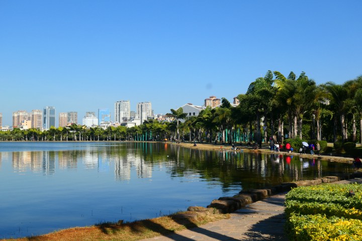 Mile staat bekend om zijn hot springs. Misschien moeten we de deur uit en daar heen! We zijn verkleumd in onze hotelkamer. We besteden er teveel tijd, al is dit allemaal nodig en zinvol geweest. Hotels in China hebben een paar zekerheden; er is een waterkoker en een koelkast. Dat laatste was vorige keer vaak een echte drankenkoelkast, de laatste weken is de kamer een koelkast. Als we buiten komen, kunnen de truien uit, het is 22`C met een sterke lentezon. Het is heerlijk! We komen niet ver en ploffen in het park onder de palmbomen neer. Wat een heerlijke plek. Hadden we hier niet het één en ander kunnen doen…? 😉