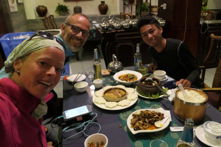 Als het op afrekenen aankomt, lukt het niet, zoals wel vaker, om te betalen voor de maaltijd. Grrrrr… We dachten alles goed te hebben gedaan: wij hebben hèm uitgenodigd én we zijn twee keer zo oud als hij. In China is het gebruikelijk dat degene die uitnodigt, betaalt en het is gebruikelijk dat de oudste de maaltijd bekostigt. Maar er is geen sprake van dat we betalen, ondanks nadrukkelijk tegengesputter van ons, regelt hij het. En waarom betaalt zo’n jonge jongen van zijn zuur verdiende centen het eten voor een stel rijke westerlingen? Snotver. We bieden nogmaals een hotelovernachting aan, welke hij wederom afslaat. Hij gaat gewoon ergens zijn tentje opzetten. We voelen ons er rot door. Volgende keer nog duidelijker van tevoren aangeven dat we alleen uit eten gaan onder voorwaarde dat wíj betalen.