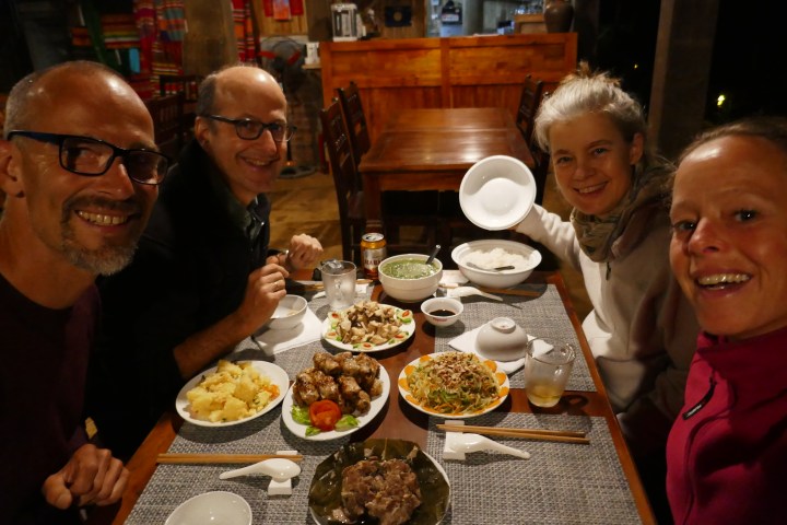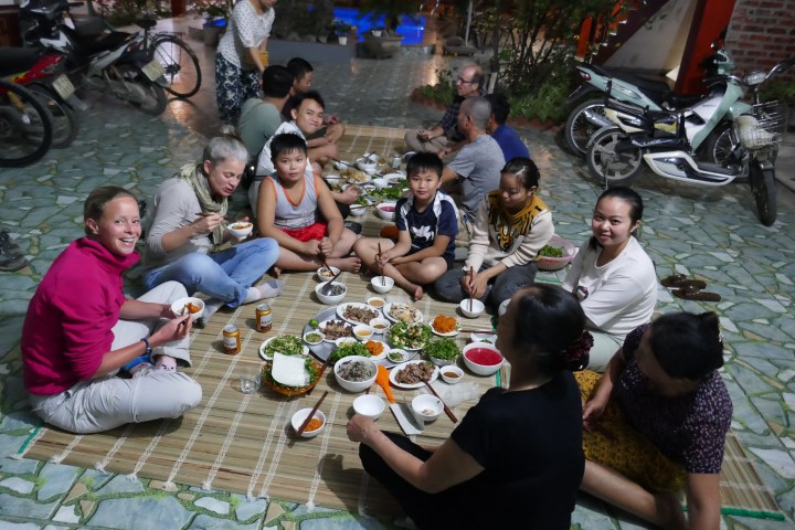 We sluiten onze vakantie af met een feestmaal. De familie van ons guesthouse nodigt ons uit mee te eten, waar we allemaal gelijk mee instemmen. Wat precies de reden is van deze feestelijke aangelegenheid, wordt ons niet helemaal duidelijk. Het eten is heerlijk en de alcohol vloeit rijkelijk. Dus we klagen niet 😉. De maaltijd krijgt wel een beetje bijzondere wending als ik in mijn pap een onderkaak aantref. Toch benieuwd wat voor dier ik aan het op eten ben, doe ik navraag. Het is een soort kleine, wilde geit. Uhm… een geit met slachttandjes zeker? Maar nee, ze verzekeren dat het een herbivoor is. Als we later toch nog wat Googlen, krijgen we het ernstige vermoeden dat we een onfortuinlijke kat (of toch een hond?) hebben gegeten. Getverderrie!!! Dit willen we helemaal niet weten! Zeker niet als kattenliefhebber ☹. Tsja het ís en blijft Vietnam. Hier wordt, net als in China, alles gegeten; hond en kat is daarbij zeker niet uitgesloten. Bah!!