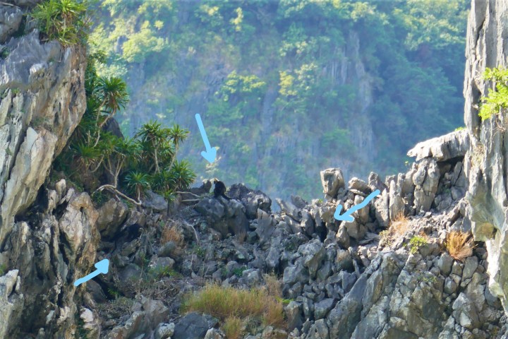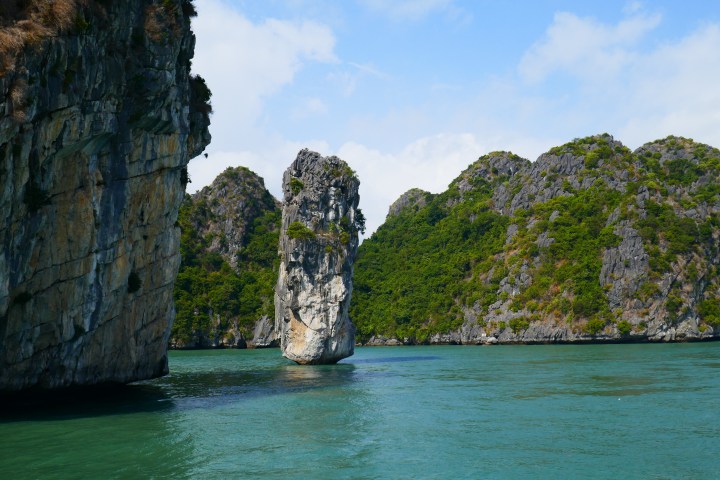 We hebben diverse stops, de eerste op Monkey Island. Een eiland met de grijpgrage makkaken en een top waar je via scherpe mooie rotsen omhoog kan klauteren. Op de top genieten we van onze eigen koffie en een prachtig uitzicht over het bijzondere landschap, alvorens terug te klauteren en verder te varen. Onderweg spot ik de bijzondere Cat Ba Langur apen, helaas te ver weg om ze goed te zien en te fotograferen en zo ver dat niemand anders ze spot. Als we de kans krijgen om 1,5 uur op eigen houtje door de wateren en door grotten te varen, zien we een groepje langurs dichterbij. Deze prachtige witkop langurs met enorme staart (85cm) zijn bijna uitgestorven en zijn nergens anders ter wereld. Er waren hier ongeveer 2.500 en dit reduceerde tot slecht 53 in 2000. Door stroperij voor het maken van traditionele medicijnen en fragmentatie van hun leefgebied. Momenteel zijn hier slechts 65 goudkoppige langurs te spotten. Eén van de meest bedreigde apensoorten ter wereld. En wij hebben het geluk deze van dichtbij (50m) te bekijken. Helaas zonder fototoestel, want sinds alle camera-trammelant durven we de camera niet meer overal mee naar toe te nemen…