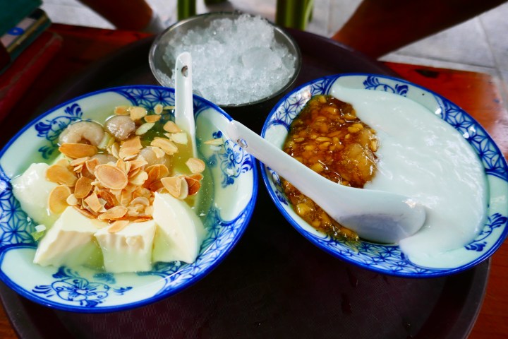 Nog geen kilometer verder zien we een druk ‘terrasje’ met gekke gerechten in kommetjes. We kijken wat het is en een Vietnamees stel vertelt gelijk dat het iets heel lekkers is, wat me moeten proberen. Dus ja, we konden niet anders en bestellen Chè khúc bach; zoete gruwel en Chè bu’ói; iets van grapefruitolie-yoghurt. Heerlijke gekke ‘desserts’ dan wel verfrissende tussendoortjes. Wauw, wat is dat lekker!