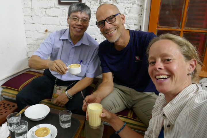 We weten nog wel dat ei-koffie “café trung” wordt genoemd en hoe fantastisch dat smaakt. Ei-koffie kwam in zwang toen Vietnam na 1975 te maken kreeg met handelsembargo’s. (Gecondenseerde) melk was daardoor schaars en dus werd eigeel samen met gecondenseerde melk opgeklopt. We dachten dat het een typische -voor toeristen- luxe koffie was. En ja dat is het misschien ook, maar uit nood geboren. Quyhn ziet er wel wat in om een koffietentje om de hoek met ei-koffie te gaan testen. De koffietent bestaat sinds 1988. Eén van de eerste commerciële bedrijven die kon ontstaan nadat de communistische partij in 1986 privébezit is gaan toestaan en de economie is opengesteld voor het buitenland. De koffietent heeft niet alleen ei-koffie maar enorm veel ei-drankjes. We gaan o.a. voor groene bonen-ei drank. Dit interessant én vies klinkende drankje blijkt een enorm romig, heerlijk toetje om de dag mee af te sluiten. Wauw! Goddelijk. En het klinkt simpel om te maken; de groene bonen is een soort puree. Geen idee hoe dat zit, maar het lijkt op glasnoedels; welke ook van groene bonen of erwten zijn gemaakt. De gelige romige substantie zijn 2 rauwe dooiers met suiker opgeklopt. Dat is alles. Wederom best risicovol maar te lekker om te laten staan. Als dat maar goed gaat!