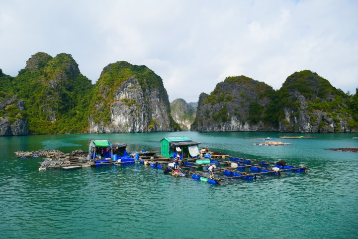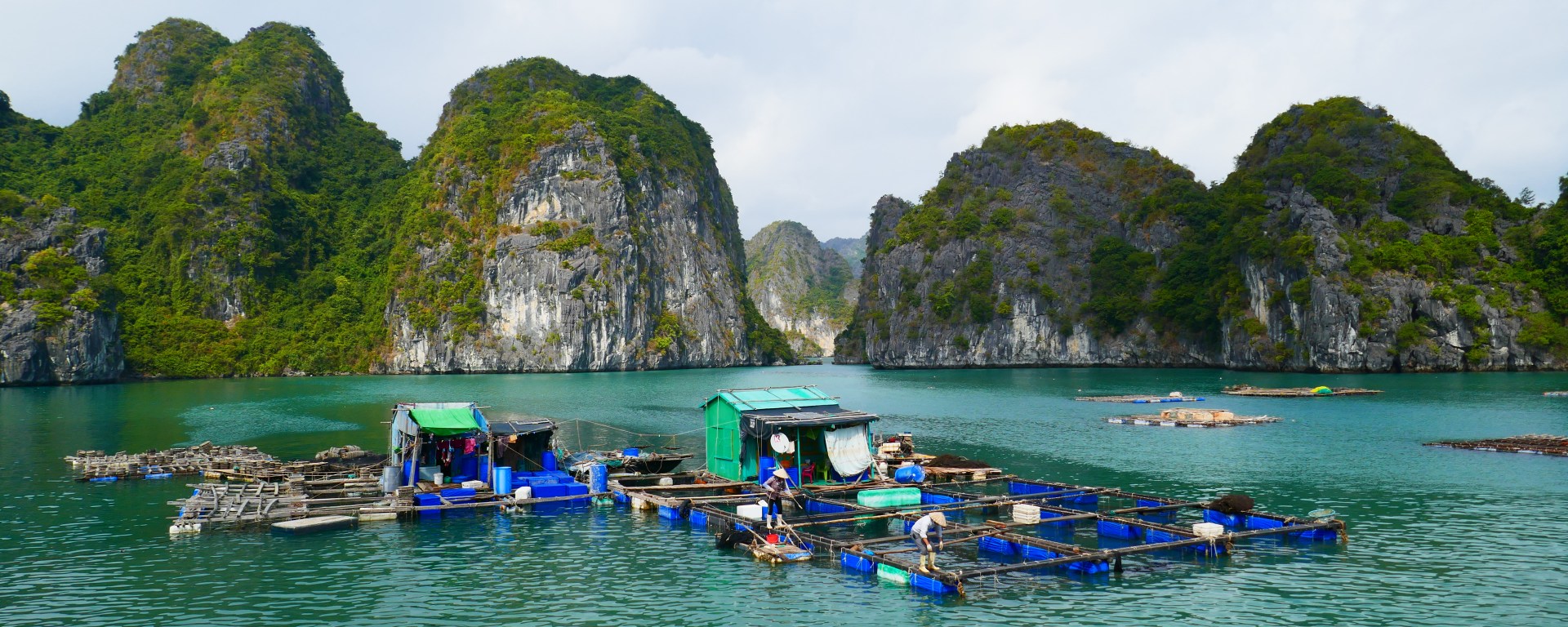 We moeten erg vroeg op. We dienen ons rond 8.00 uur bij de boot te melden en hebben nog 12,5 km te fietsen met wat bergjes tussendoor. Bovendien willen we graag nog even pinnen en wat eten halen voor onderweg. Om 7.00 uur zitten we op de fiets, we komen langs de markt waar we gelijk slagen met een tros bananen en wat knaagwortels. Het pinnen lukt niet omdat alle drie de pinautomaten buiten gebruik waren. We berekenen dat we net moeten uitkomen met nog 2 nachten, 2 dagen eten en 1 boot te gaan naar Halong Bay stad, waar de volgende pinautomaat staat. In de haven gaat het soepeltjes, we parkeren de fietsen met bagage bij een parkeerwachter die er niet op zit te wachten, maar tegen betaling kan alles. Om 8.30 uur gaan we met een hele meute de boot op en varen met een heerlijk zonnetje het prachtige karstgebergte door. Overal drijvende vissersdorpjes tussen puntbergen. Wauw wat ziet het hier prachtig uit! Het lijkt op Ninh Binh waar we net vandaan komen, waardoor we er al bijna aan gewend raken. Echter dit is iets wat we daarvoor nooit eerder hebben gezien!