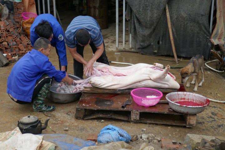 Ik heb een podcast geluisterd van een immense sporter die van dagelijks 1 kg kip en 1 kg biefstuk is overgegaan op een veganistische leefstijl. Hij wil dat er op de hele wereld geen dierlijke producten meer worden gebruikt. De podcast was niet geweldig, maar zet je toch aan het denken. Vooral als je vervolgens in elk dorp dieren geslacht ziet worden. Vandaag was het duidelijk varkensslachtdag. We zien opengereten varkens waar ze in het openbaar alle ingewanden uit halen. We staren naar varkens die onthaard worden met kokend water en een mes. En zijn getuige van de wijze van doodmaken van de varkens. Met 4 man staan ze om het varken, het varken ligt op de rug, de poten vastgebonden. Met een groot slachtmes gaan ze zo de keel (aorta?) in, terwijl het varken tegenstribbelt. Het varken bloedt zo snel dood. Terwijl een hond ondertussen het gemorste bloed drinkt…