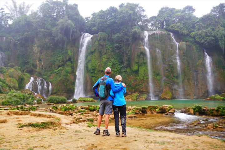 De waterval Ban Gioc is een bijzondere waterval. Het is de grootste van Azië. Nou ja, de breedste eigenlijk. Met 35m hoogte is de waterval klein, de 300m breed is blijkbaar heel groot. Daarmee is het de 4e grootste waterval ter wereld die zich op 2 landsgrenzen bevindt. Wat een contrast tussen de Vietnamese en de Chinese kant. Wij moeten het doen met modderige paadjes, de Chinezen hebben keurige trappen en betonpaden naar de bootjes, om de waterval vanaf het water te bekijken. Op het water wordt af en toe gehandeld tussen de Vietnamezen en Chinezen.