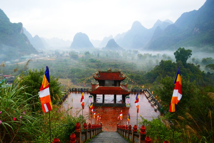 Voordat we verder gaan, gaan we eerst een klein stukje terug richting de waterval. Gisteren hebben we een tempel gemist die erg de moeite waard schijnt te zijn. De tempel zelf, maar vooral het uitzicht vanaf de tempel op de Ban Gioc waterval. Als we op de fiets zitten, zien we inderdaad wat blauwe stukjes lucht, dus wie weet, komt die zon inderdaad door? We klauteren de trappen op van de tempel en met de laaghangende bewolking en de spectaculaire bergen is het uitzicht inderdaad zeer de moeite waard. De andere kant op hebben we een mooi overzicht over de volle breedte van de waterval. Het is een kort uitstapje en erg de moeite waard. Fijn dat we die tip toch nog even opgevolgd hebben.