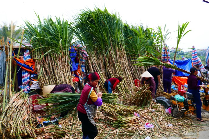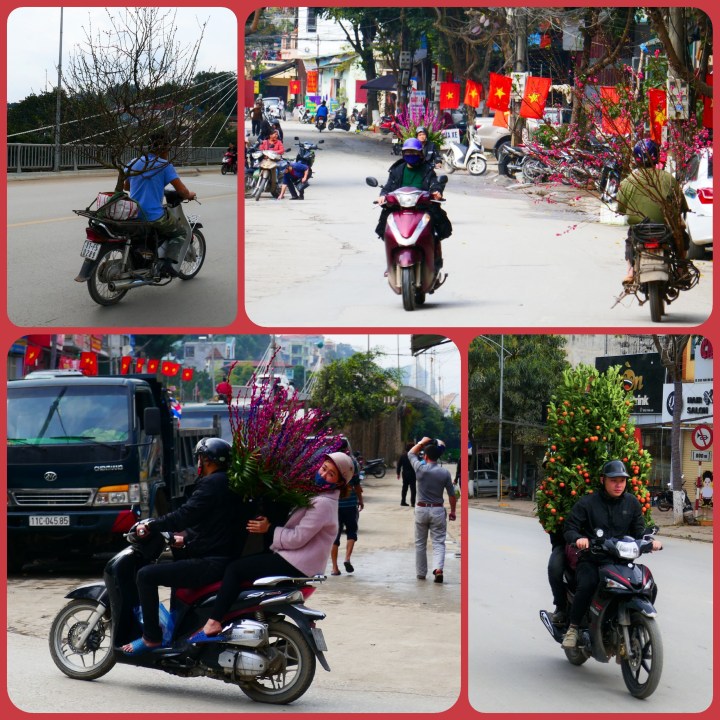 Al een paar weken zien we de voorbereidingen voor dit grootse feest in volle gang. Mensen houden grote schoonmaak, versieren hun huizen en de markten staan vol kleurrijke bloemen en bomen. In plaats van kerstbomen, zetten Vietnamezen perzikbomen met zijn mooie roze bloesem (vooral in het noorden van Vietnam) of een kumquatboom in huis en worden de huizen versierd met rode en gele versiersels. Brommers rijden af en aan. Aan het stuur en achterop hangen zakken groente, fruit, koek, snoep, (onlangs nog) levende kippen en vissen. Geregeld zien we brommers met achterop iemand die grote lijsten met foto’s of mooie plaatjes voorzichtig over de hobbels en bobbels vervoert om het huis te versieren. Of ze dragen een bos suikerriet op de schouder voor het maken van sap. Hele bomen komen voorbij, in de auto, op de auto, achterop de brommer of op de fiets.