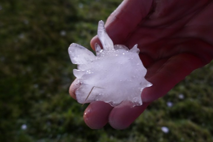 Wegwezen hier! Terwijl wij naar droge, veilige oorden vluchten, zien en horen we de hagelstenen inslaan op auto’s en ruiten. Het regent bladeren en takken en binnen de kortste keren ligt de straat vol rotzooi en smeltend ijs. Het duurt een minuut of 20, maar in die tijd is het hele programma op zijn kop gegooid. De show is gestopt, auto’s hebben aanzienlijke schade, maar iedereen lijkt gelukkig op tijd een veilig onderkomen te hebben gevonden.